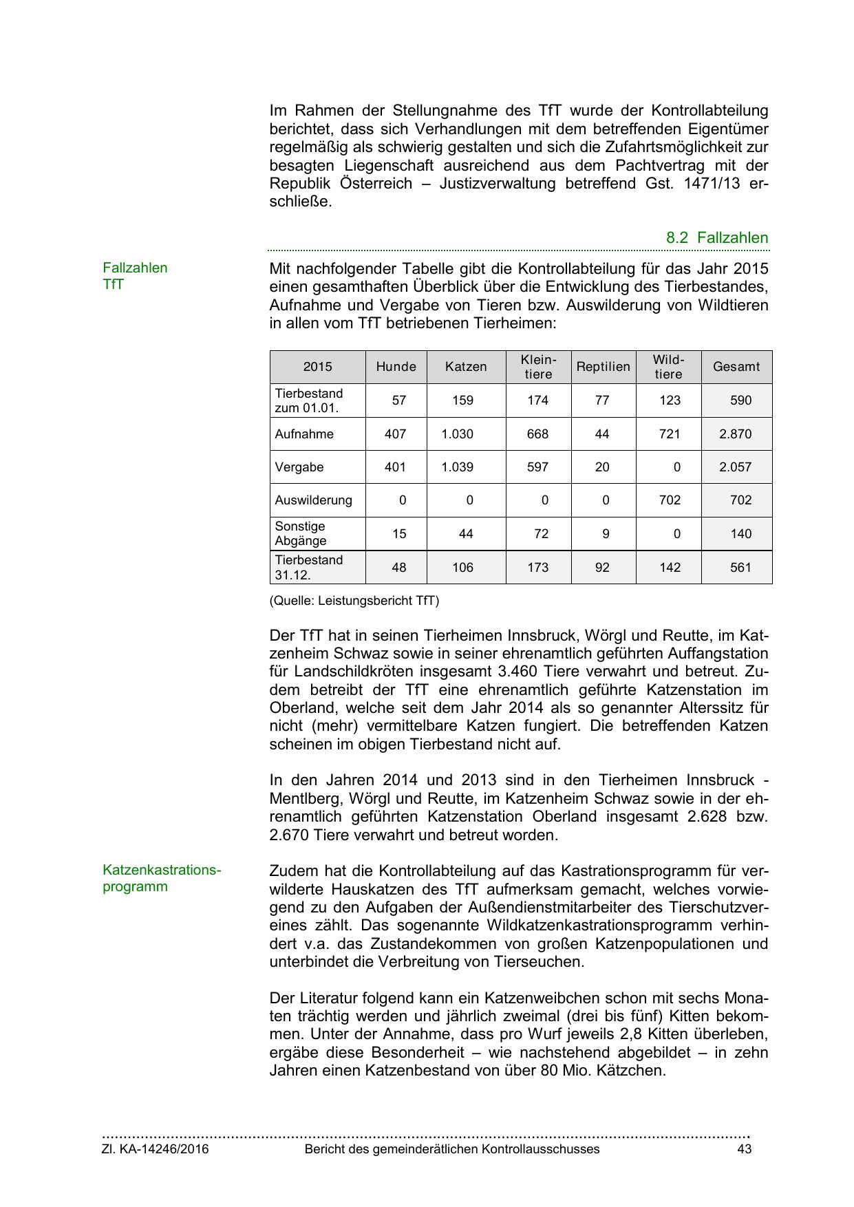 In den Jahren 2014 und 2013 sind in den Tierheimen Innsbruck Mentlberg, Wörgl und Reutte, im Katzenheim Schwaz sowie in der ehrenamtlich geführten Katzenstation Oberland insgesamt 2.628 bzw.