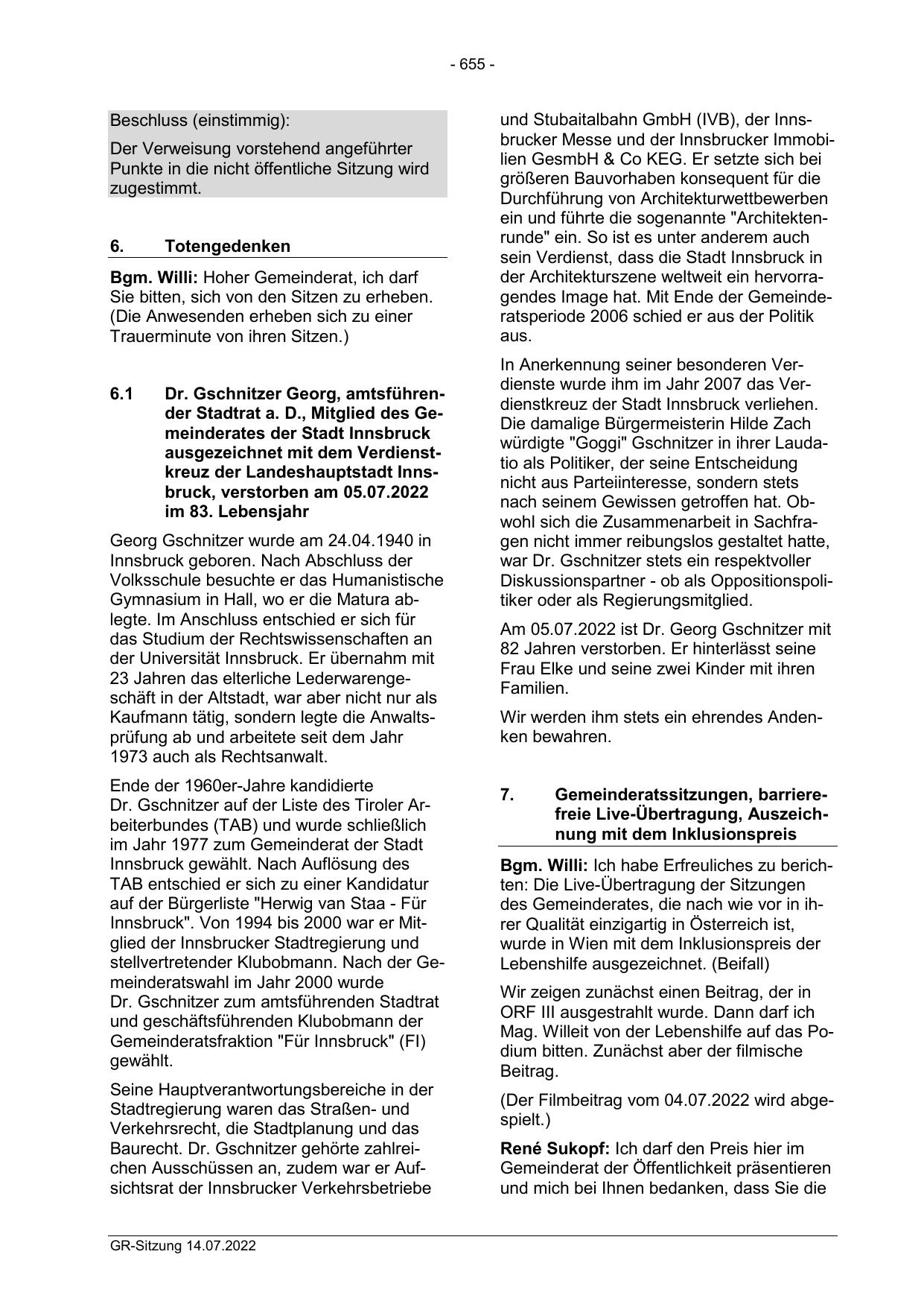 Dr. Gschnitzer Georg, amtsführender Stadtrat a. D., Mitglied des Gemeinderates der Stadt Innsbruck