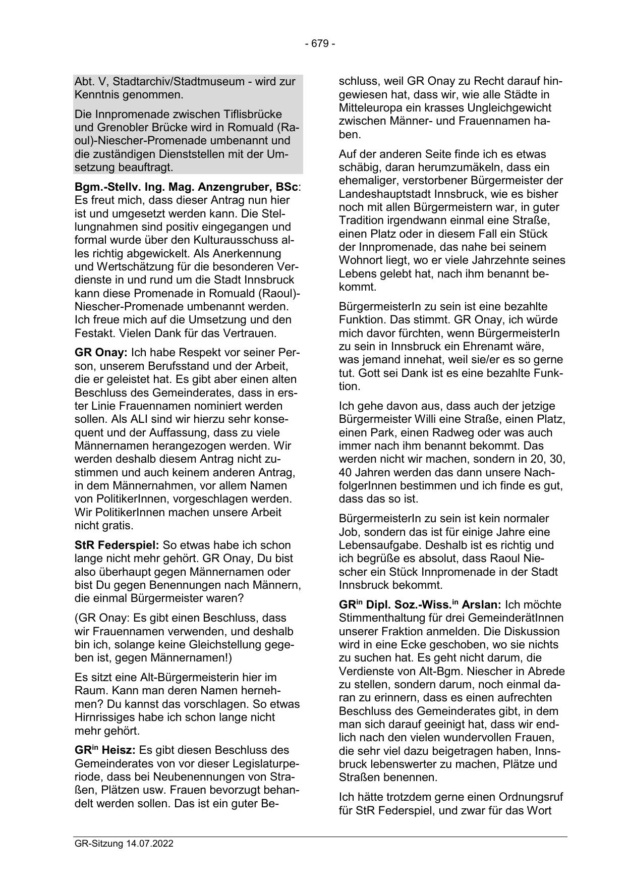 Gemeinderates von vor dieser Legislaturperiode, dass bei Neubenennungen von Straßen, Plätzen usw. Frauen bevorzugt behandelt werden sollen. Das ist ein guter BeGR-Sitzung 14.07.2022