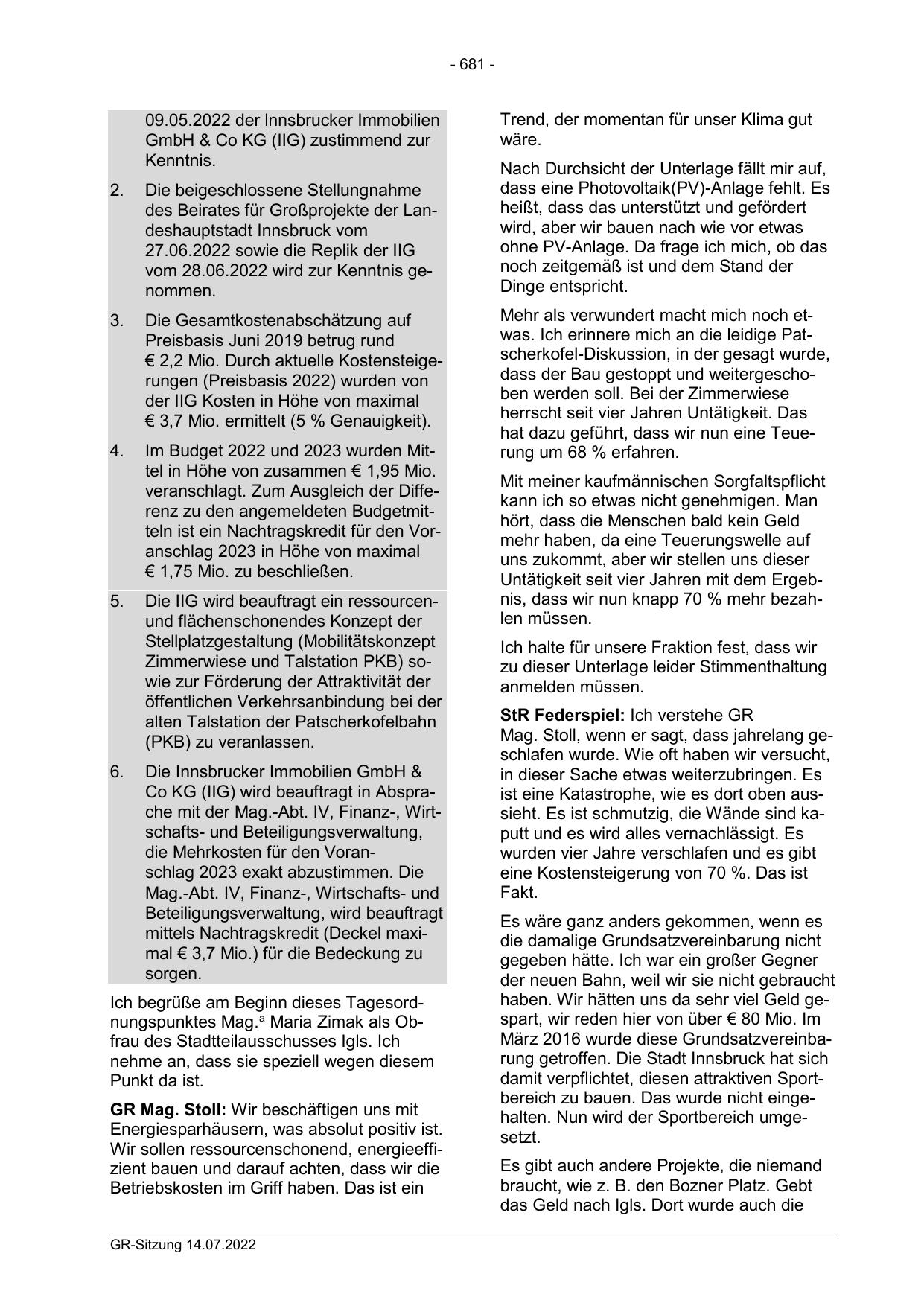 Ich begrüße am Beginn dieses Tagesordnungspunktes Mag.a Maria Zimak als Obfrau des Stadtteilausschusses Igls. Ich
