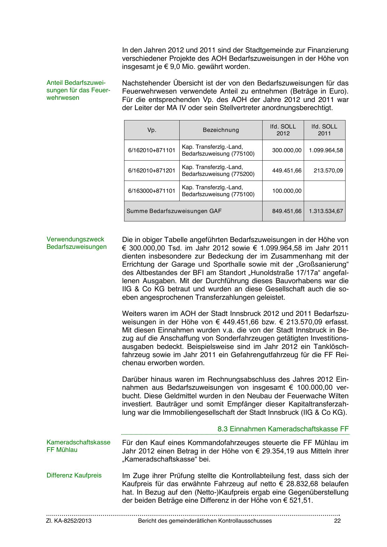 Weiters waren im AOH der Stadt Innsbruck 2012 und 2011 Bedarfszuweisungen in der Höhe von € 449.451,66 bzw. € 213.570,09 erfasst.
