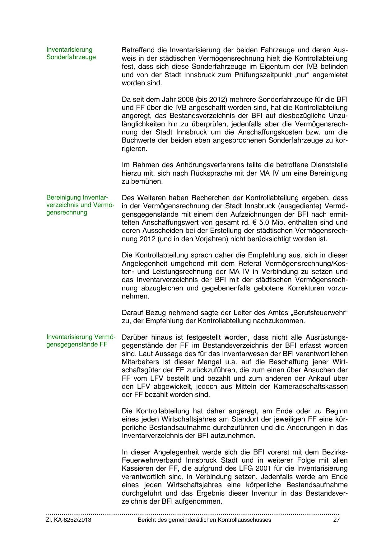 angeregt, das Bestandsverzeichnis der BFI auf diesbezügliche Unzulänglichkeiten hin zu überprüfen, jedenfalls aber die Vermögensrechnung der Stadt Innsbruck um die Anschaffungskosten bzw. um die