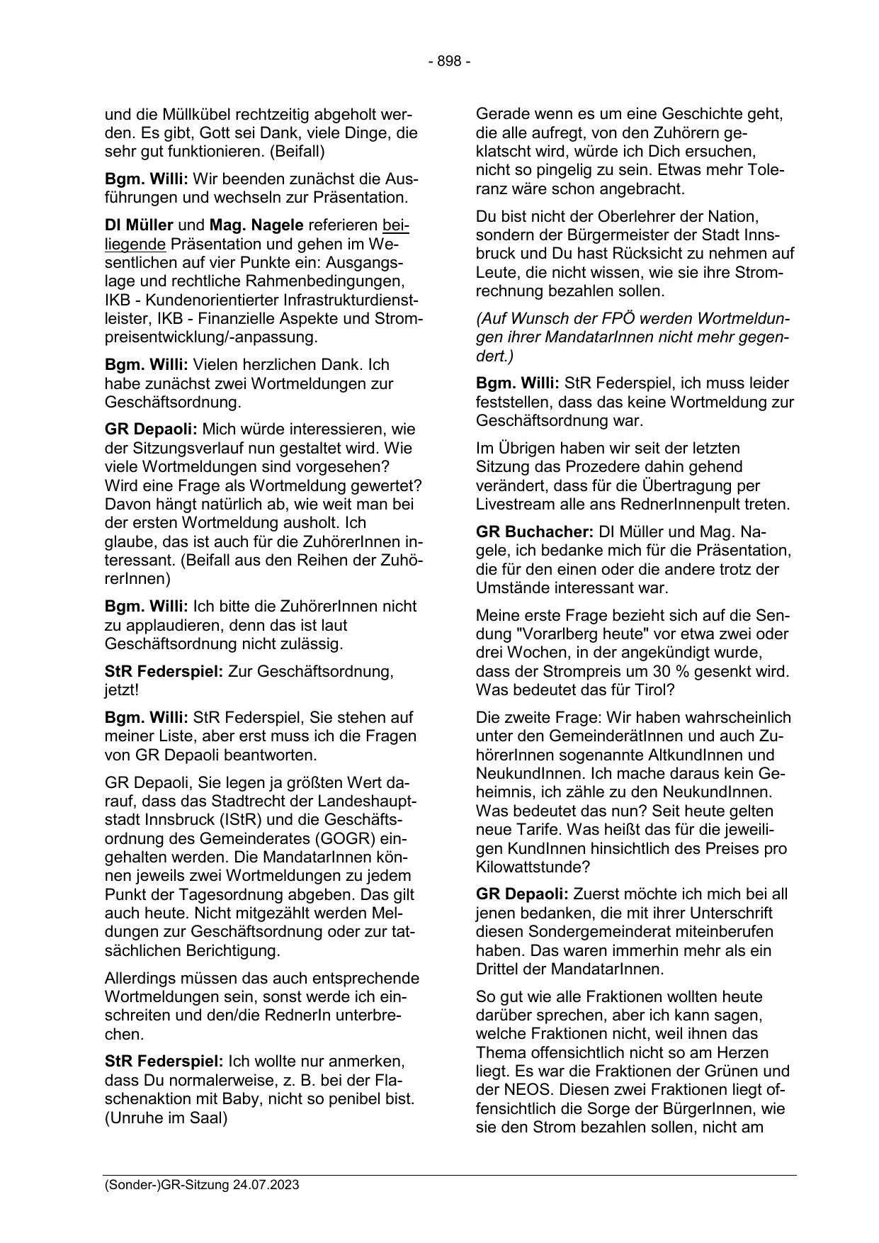 GR Depaoli, Sie legen ja größten Wert darauf, dass das Stadtrecht der Landeshauptstadt Innsbruck (IStR) und die Geschäftsordnung des Gemeinderates (GOGR) eingehalten werden. Die MandatarInnen können jeweils zwei Wortmeldungen zu jedem