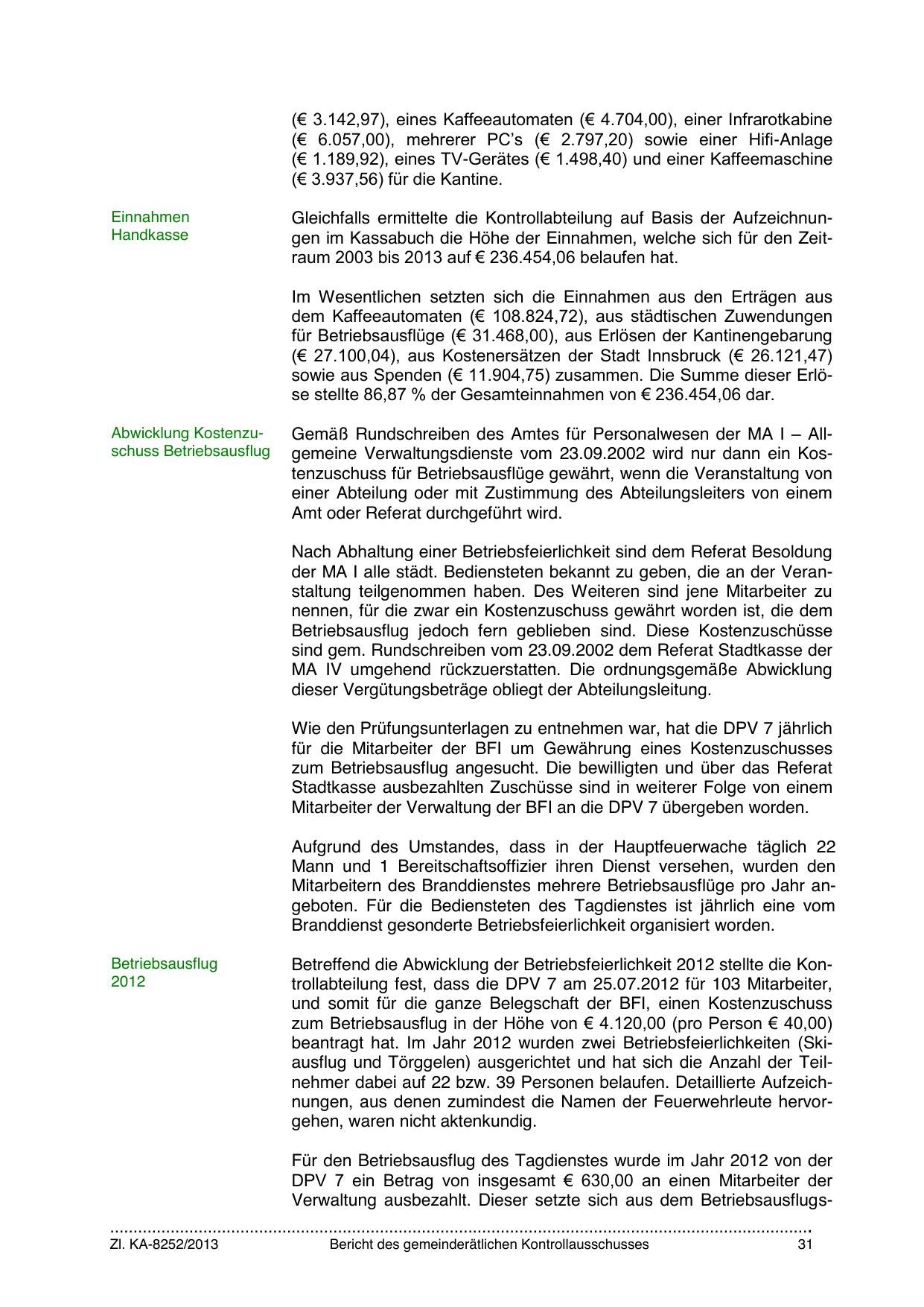 Betreffend die Abwicklung der Betriebsfeierlichkeit 2012 stellte die Kontrollabteilung fest, dass die DPV 7 am 25.07.2012 für 103 Mitarbeiter,