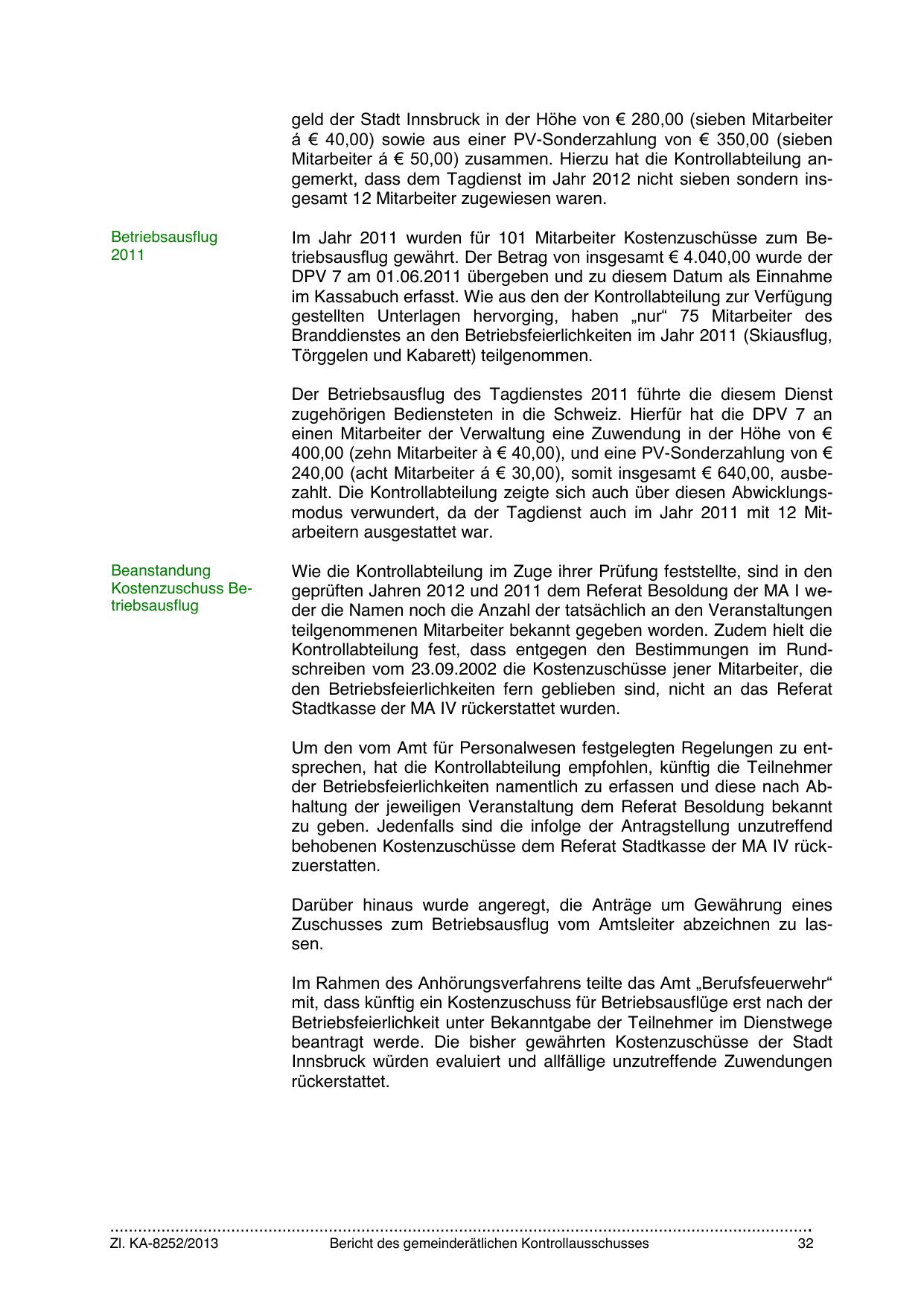 Im Jahr 2011 wurden für 101 Mitarbeiter Kostenzuschüsse zum Betriebsausflug gewährt. Der Betrag von insgesamt € 4.040,00 wurde der