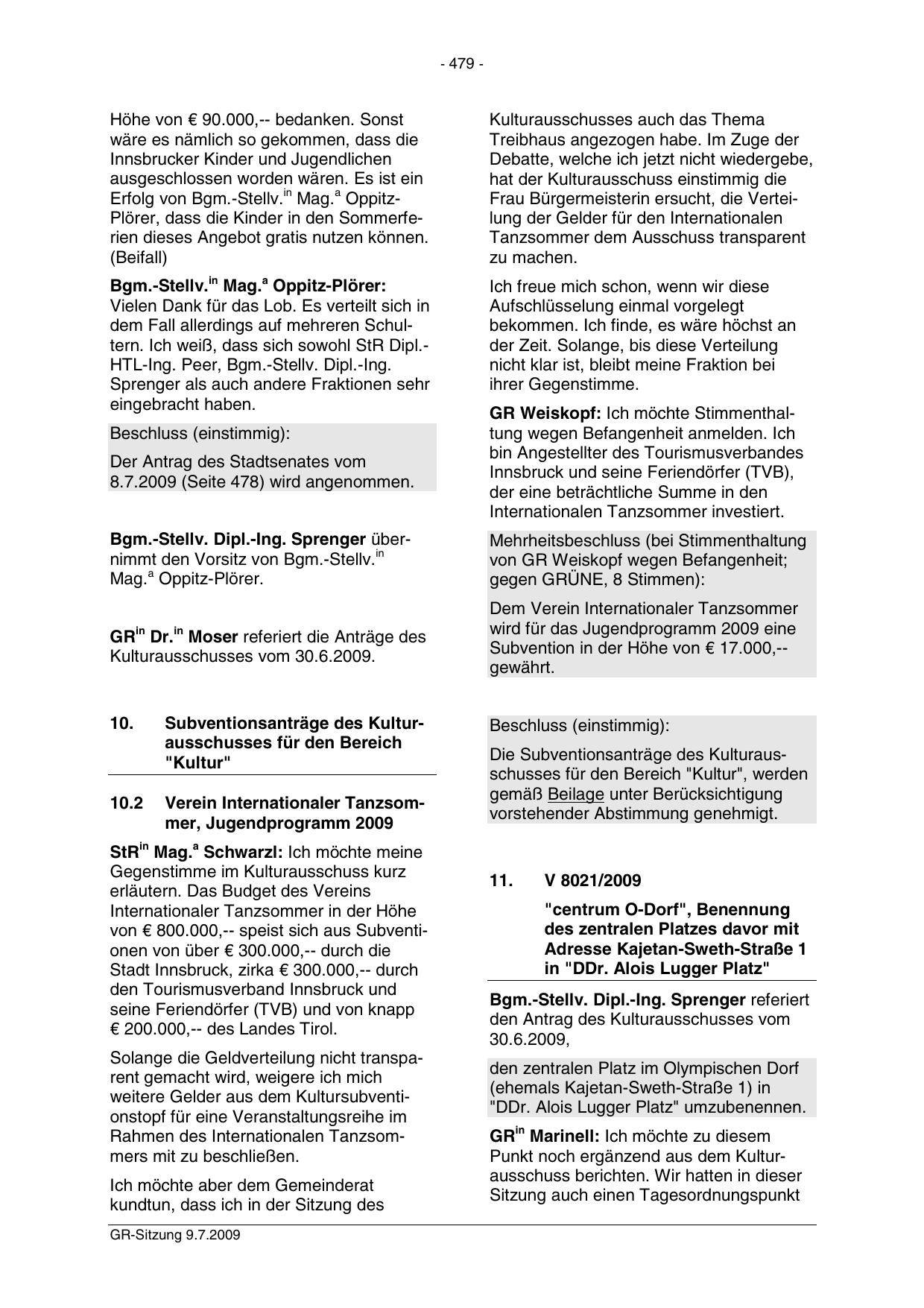 Frau Bürgermeisterin ersucht, die Verteilung der Gelder für den Internationalen