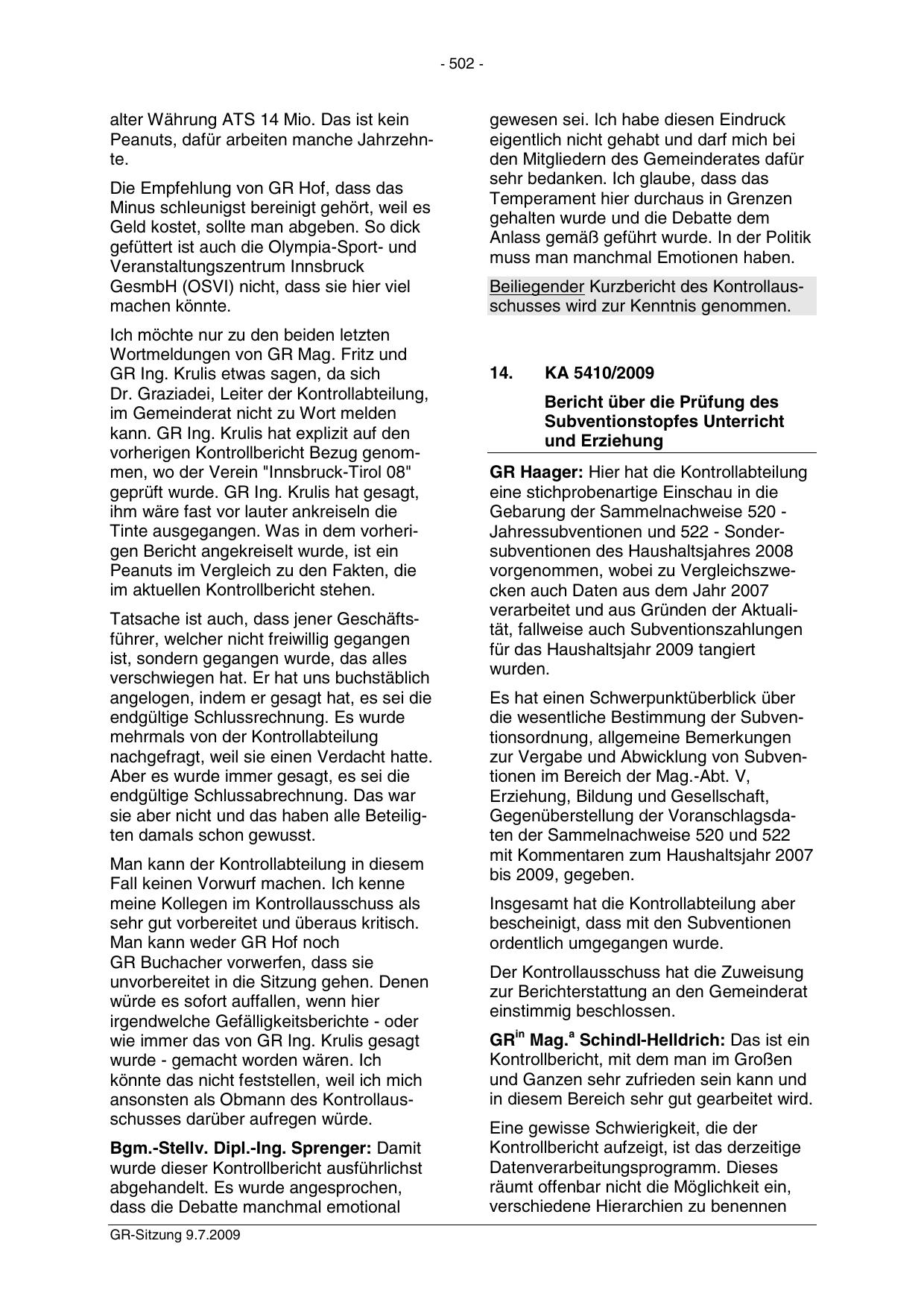 ansonsten als Obmann des Kontrollausschusses darüber aufregen würde.