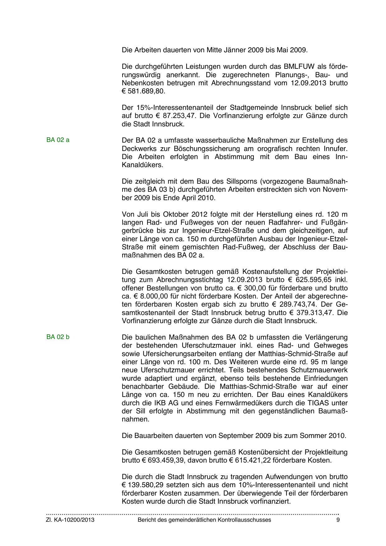 ca. € 8.000,00 für nicht förderbare Kosten. Der Anteil der abgerechneten förderbaren Kosten ergab sich zu brutto € 289.743,74. Der Gesamtkostenanteil der Stadt Innsbruck betrug brutto € 379.313,47. Die