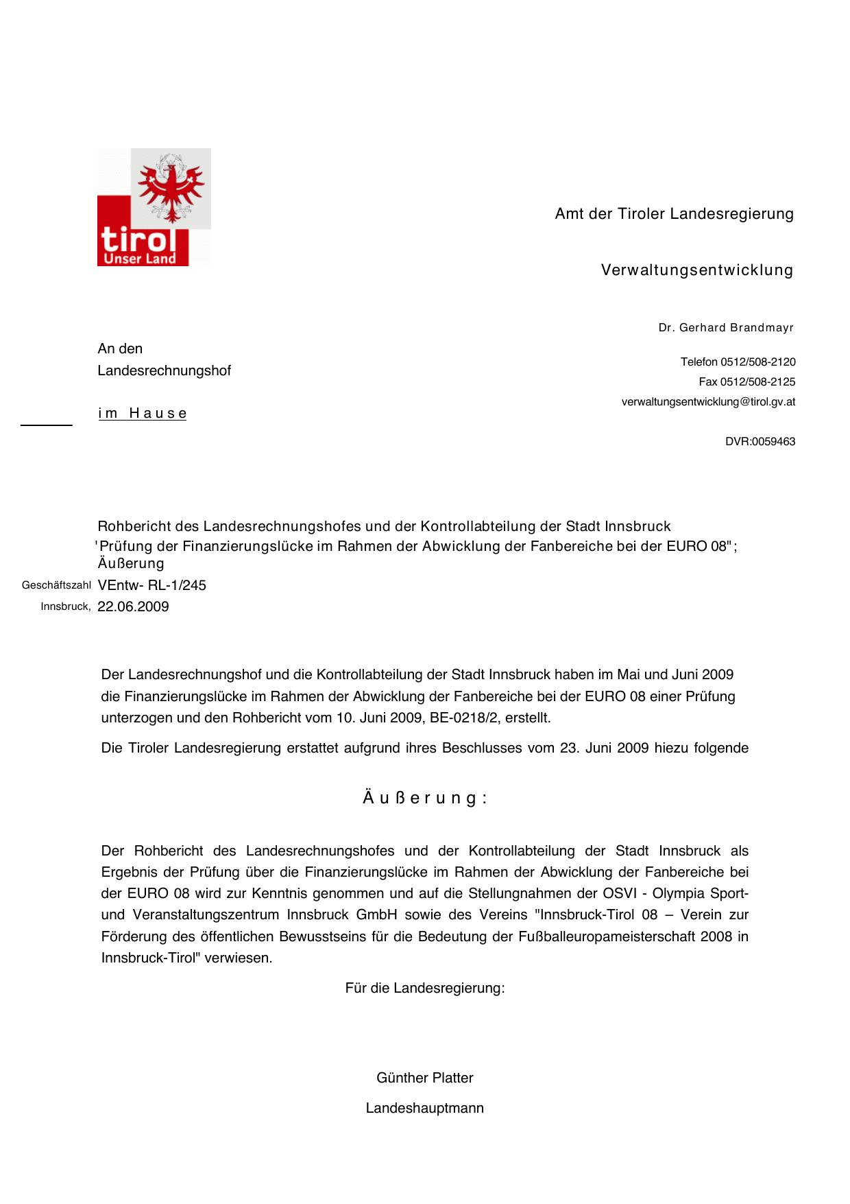Die Tiroler Landesregierung erstattet aufgrund ihres Beschlusses vom 23. Juni 2009 hiezu folgende