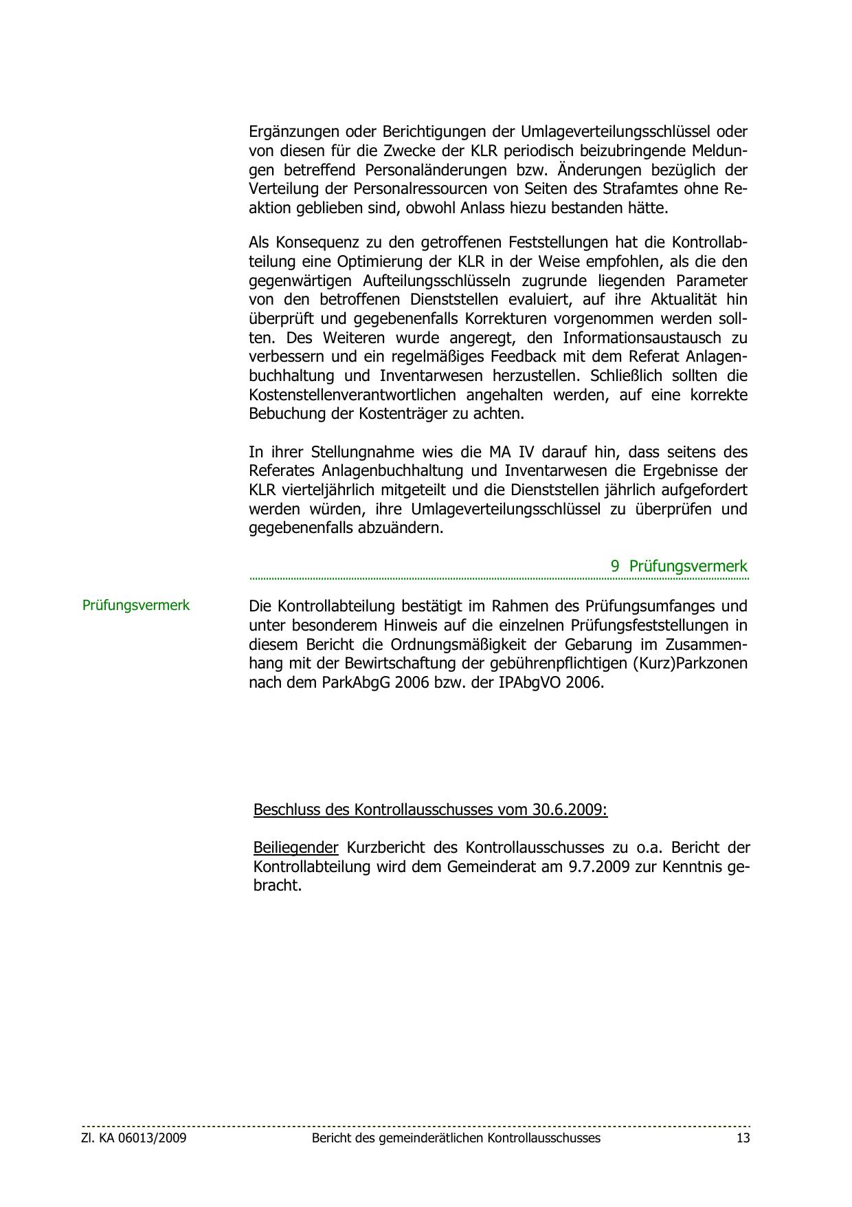 Kontrollabteilung wird dem Gemeinderat am 9.7.2009 zur Kenntnis gebracht.