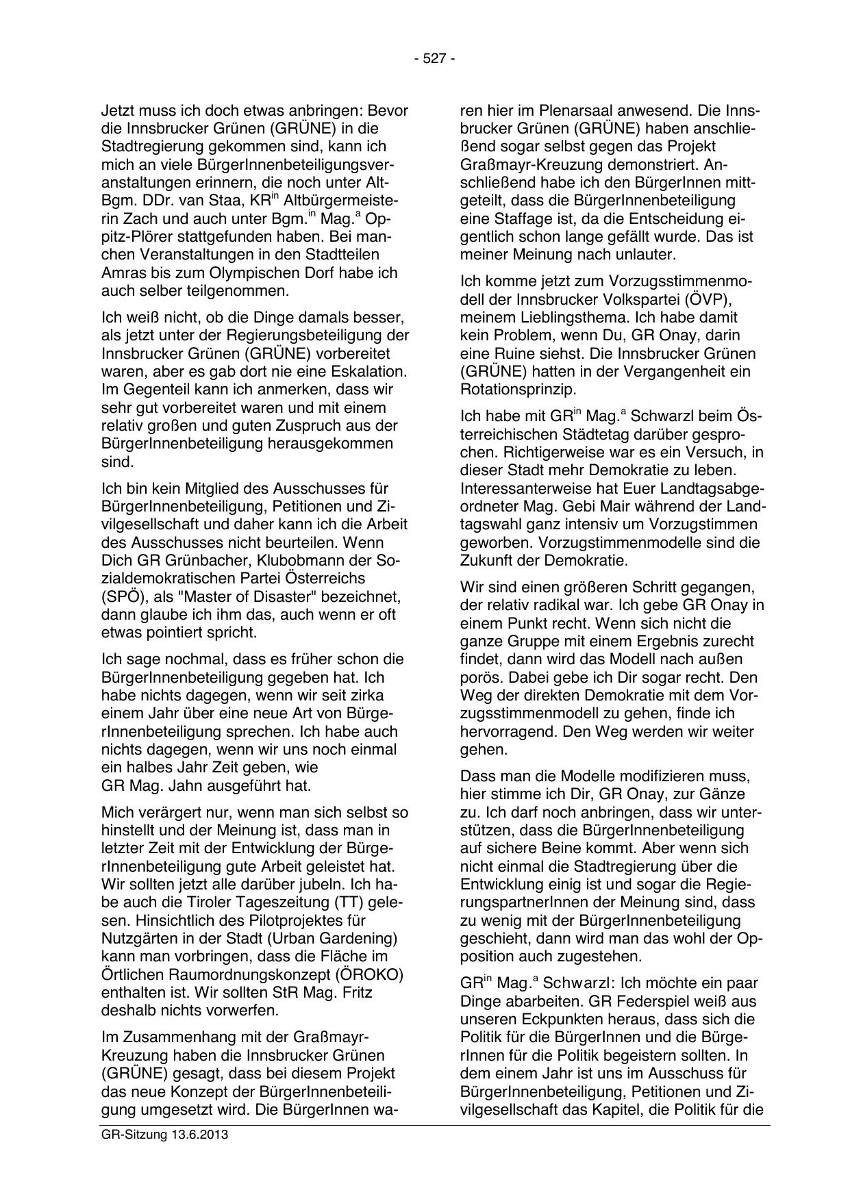 mich an viele BürgerInnenbeteiligungsveranstaltungen erinnern, die noch unter AltBgm. DDr. van Staa, KRin Altbürgermeisterin Zach und auch unter Bgm.in Mag.a Oppitz-Plörer stattgefunden haben. Bei manchen Veranstaltungen in den Stadtteilen
