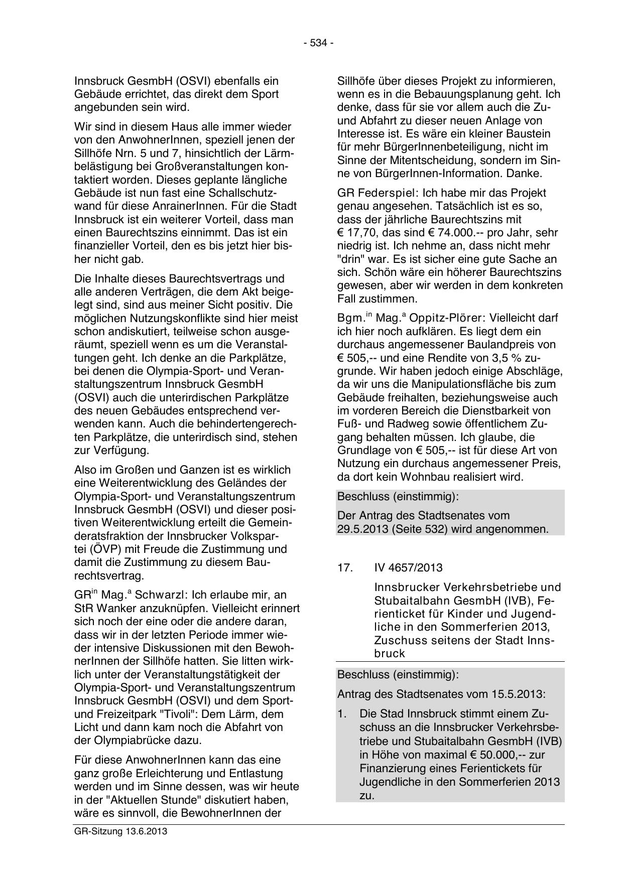 Innsbruck GesmbH (OSVI) und dieser positiven Weiterentwicklung erteilt die Gemeinderatsfraktion der Innsbrucker Volkspartei (ÖVP) mit Freude die Zustimmung und