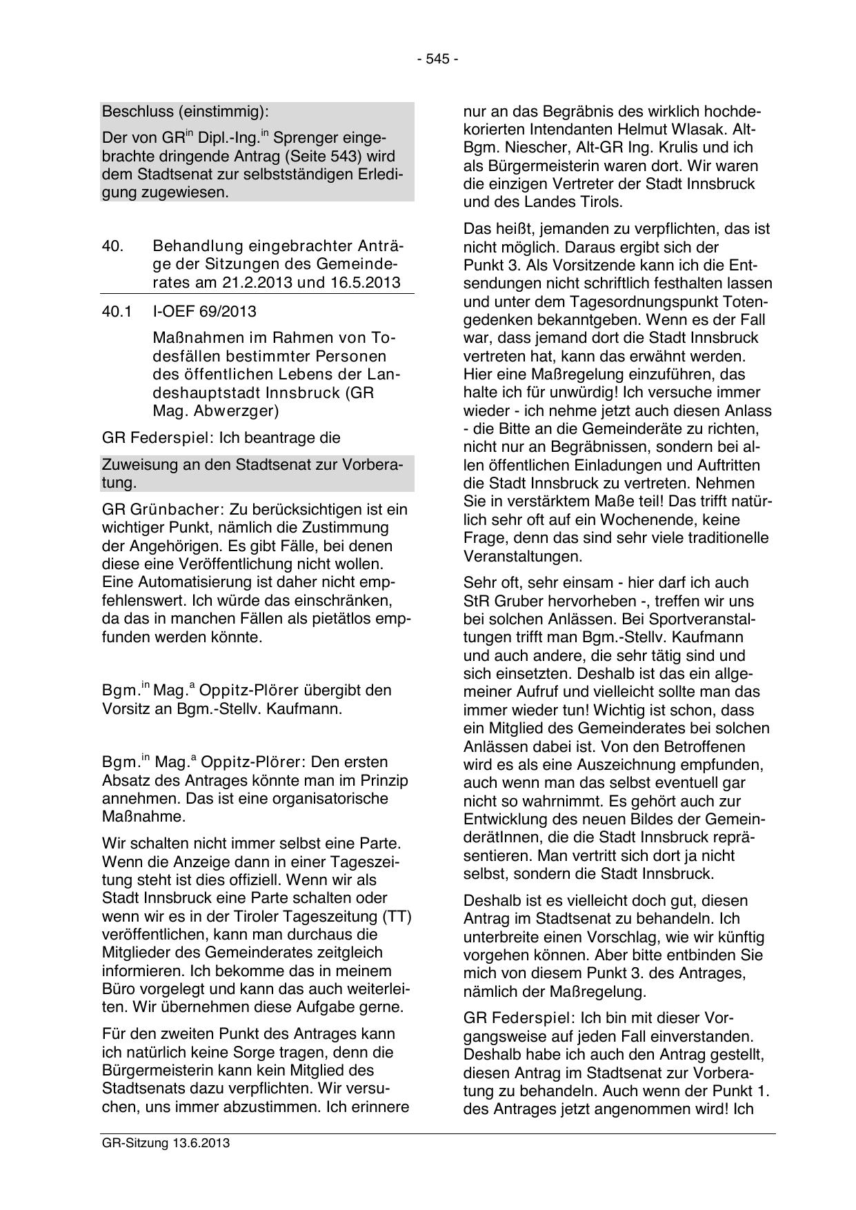 des öffentlichen Lebens der Landeshauptstadt Innsbruck (GR
