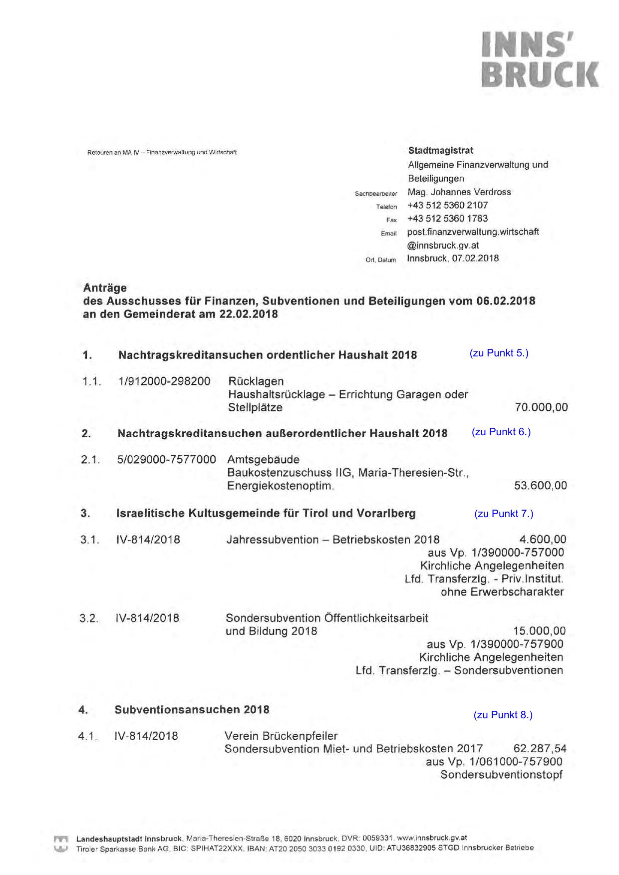 Nachtragskreditansuchen außerordentlicher Haushalt 2018