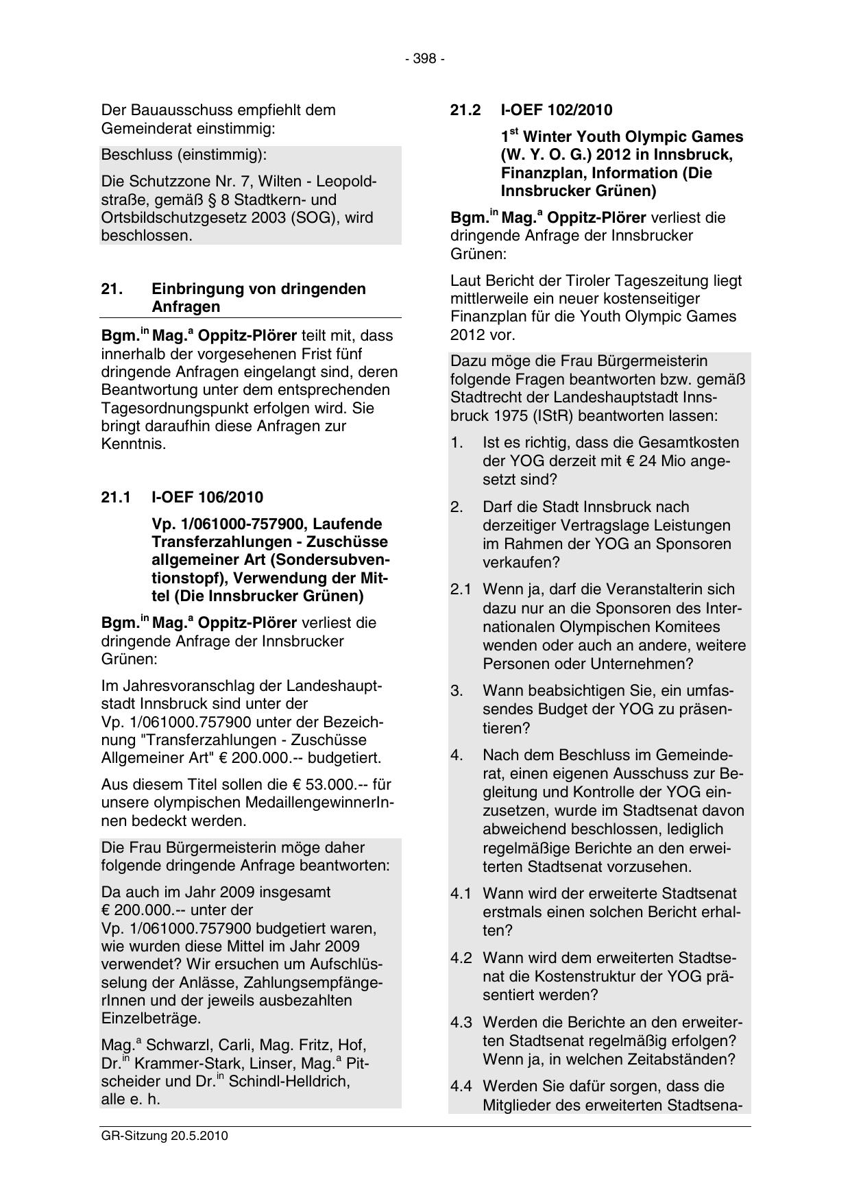 Stadtrecht der Landeshauptstadt Innsbruck 1975 (IStR) beantworten lassen: