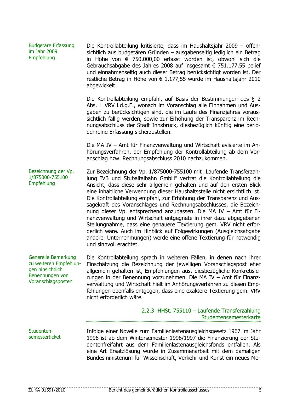 Die Kontrollabteilung empfahl, zur Erhöhung der Transparenz und Aussagekraft des Voranschlages und Rechnungsabschlusses, die Bezeichnung dieser Vp. entsprechend anzupassen. Die MA IV – Amt für Finanzverwaltung und Wirtschaft entgegnete in ihrer dazu abgegebenen