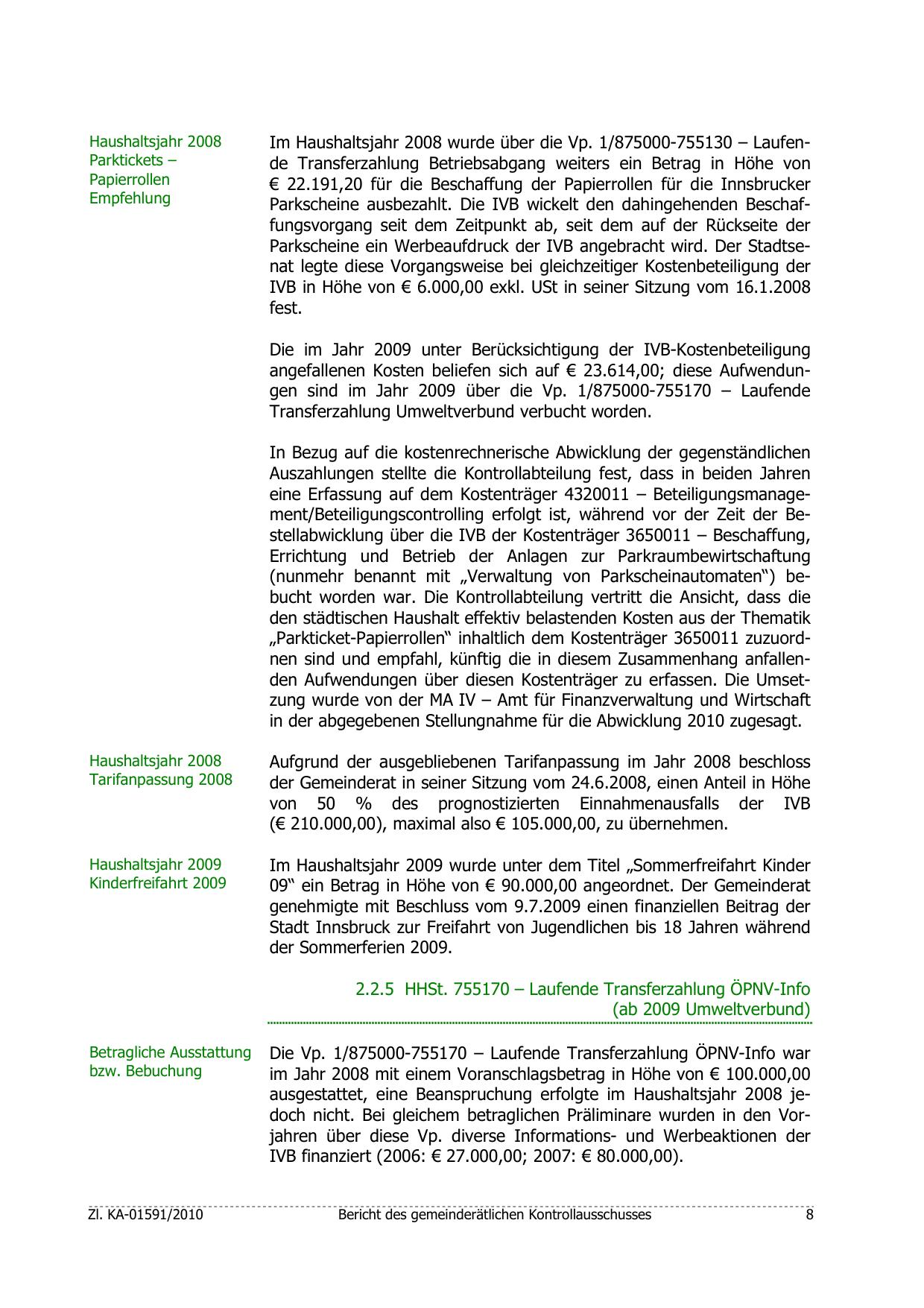 Parkscheine ausbezahlt. Die IVB wickelt den dahingehenden Beschaffungsvorgang seit dem Zeitpunkt ab, seit dem auf der Rückseite der