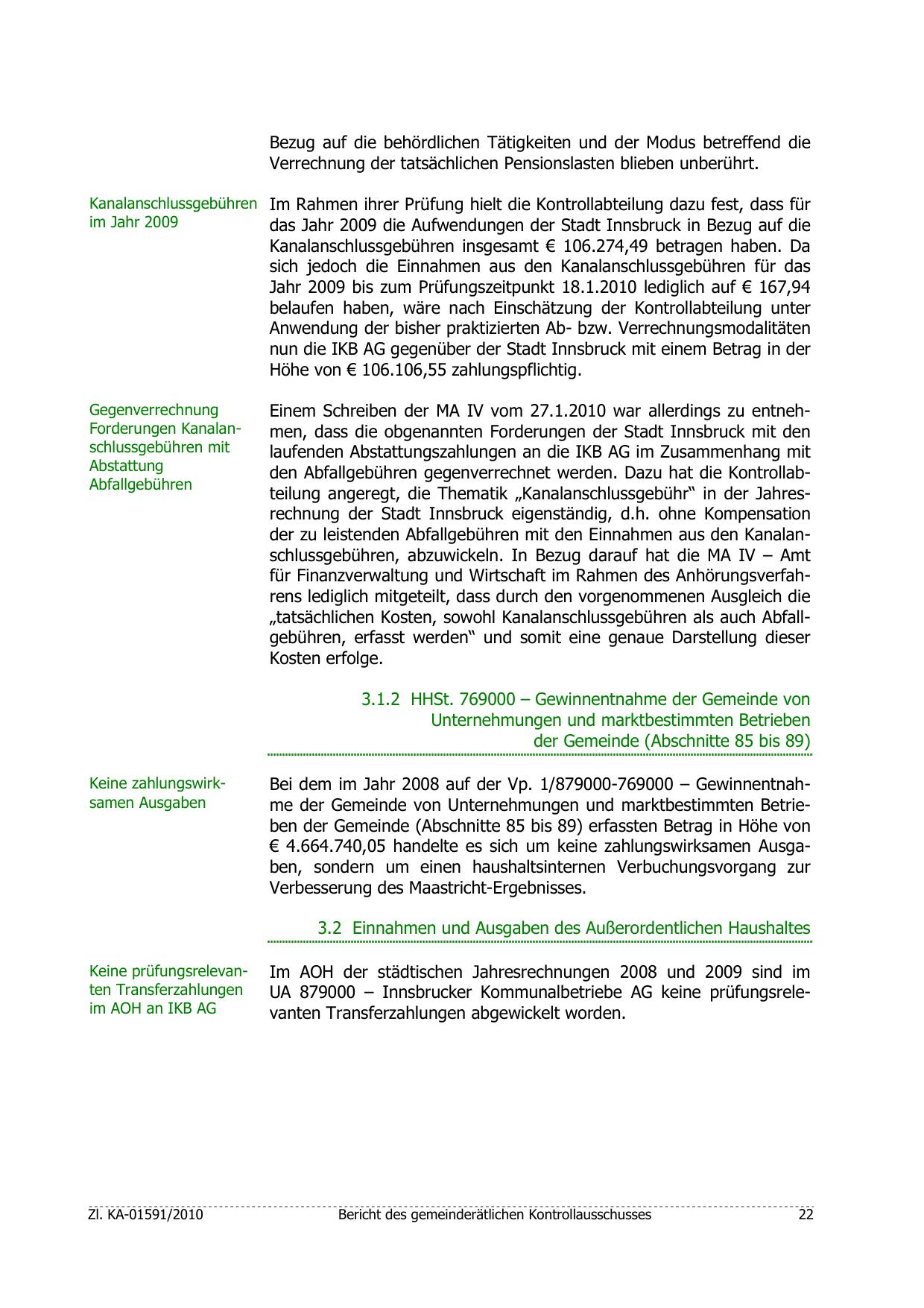 den Abfallgebühren gegenverrechnet werden. Dazu hat die Kontrollabteilung angeregt, die Thematik „Kanalanschlussgebühr“ in der Jahresrechnung der Stadt Innsbruck eigenständig, d.h. ohne Kompensation