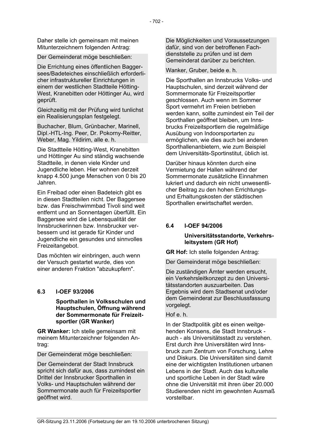 GR-Sitzung 23.11.2006 (Fortsetzung der am 19.10.2006 unterbrochenen Sitzung)