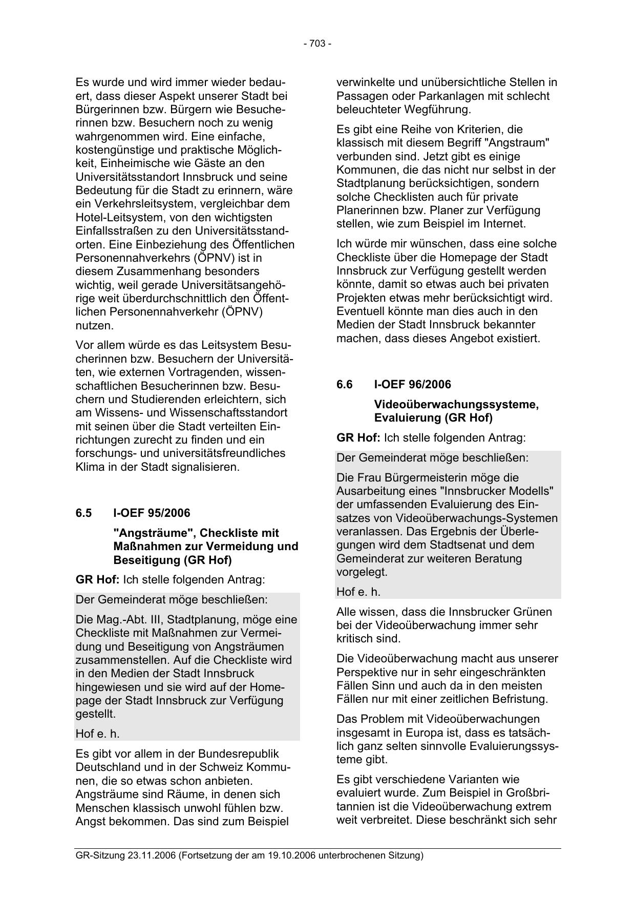 GR-Sitzung 23.11.2006 (Fortsetzung der am 19.10.2006 unterbrochenen Sitzung)