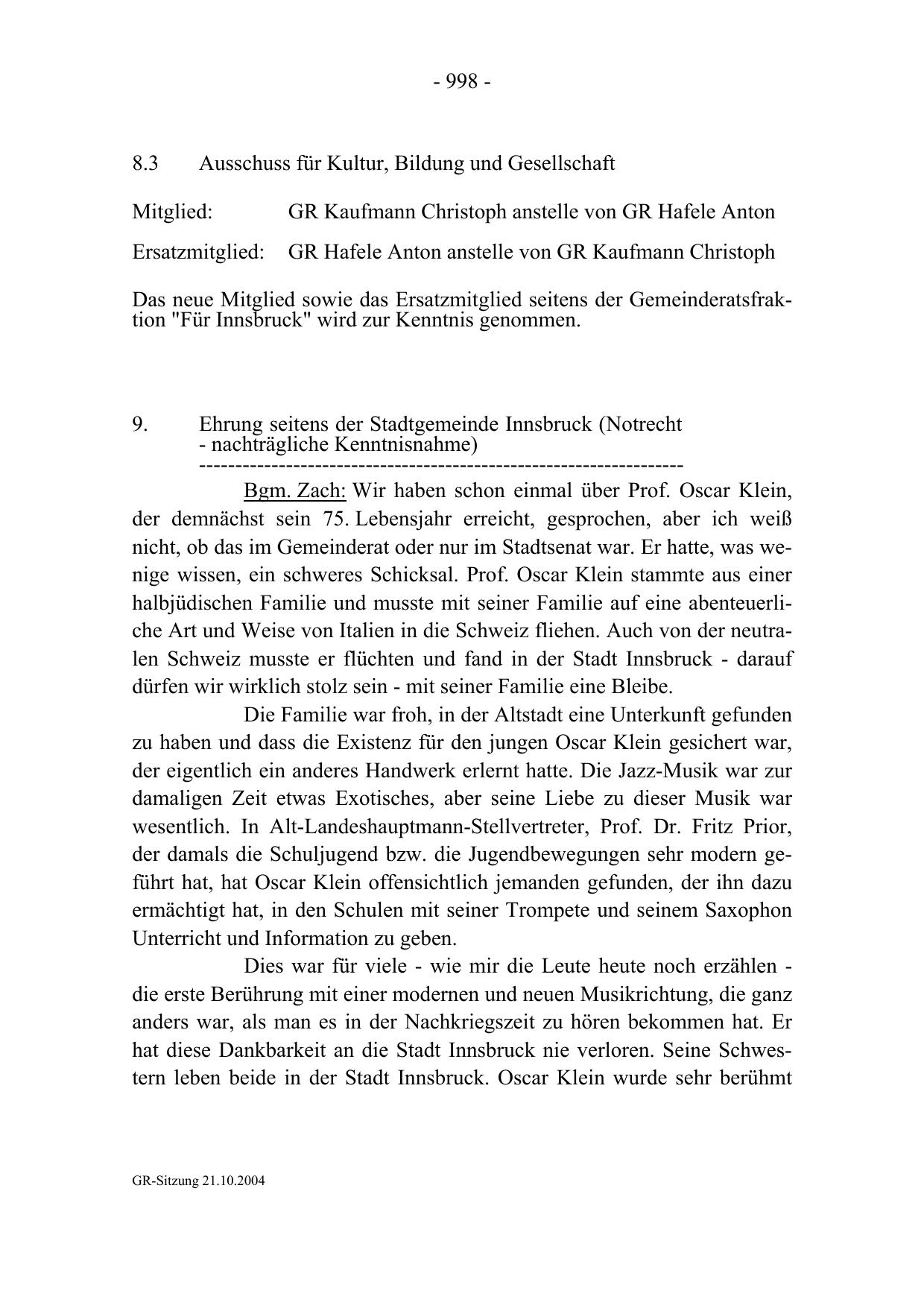 nicht, ob das im Gemeinderat oder nur im Stadtsenat war. Er hatte, was wenige wissen, ein schweres Schicksal. Prof. Oscar Klein stammte aus einer