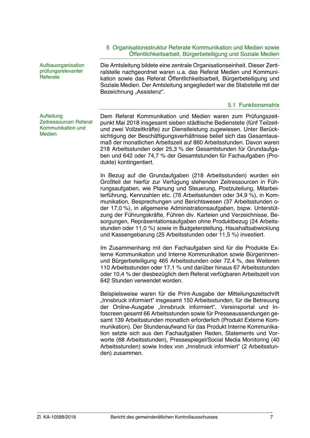 Dem Referat Kommunikation und Medien waren zum Prüfungszeitpunkt Mai 2018 insgesamt sieben städtische Bedienstete (fünf Teilzeitund zwei Vollzeitkräfte) zur Dienstleistung zugewiesen. Unter Berücksichtigung der Beschäftigungsverhältnisse belief sich das Gesamtausmaß der monatlichen Arbeitszeit auf 860 Arbeitsstunden. Davon waren