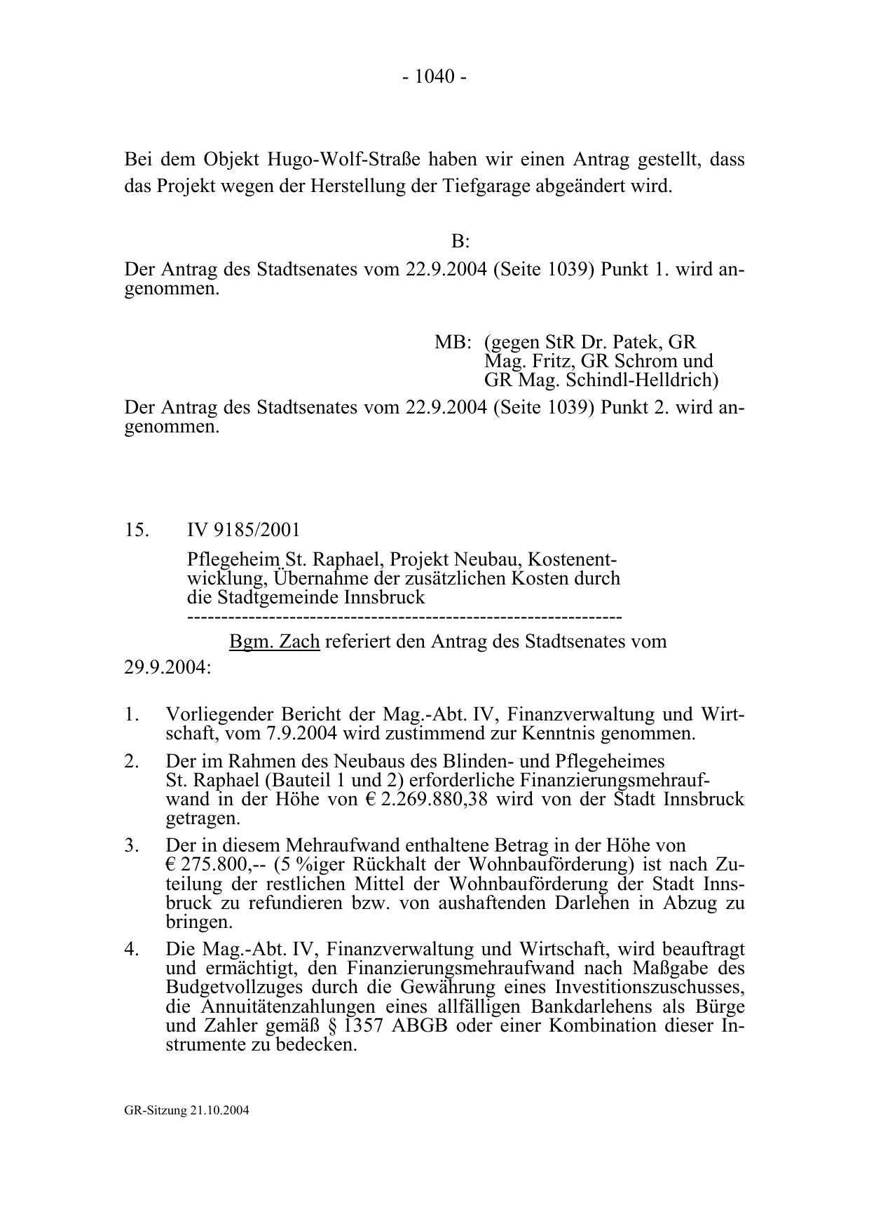 Der Antrag des Stadtsenates vom 22.9.2004 (Seite 1039) Punkt 1. wird angenommen.