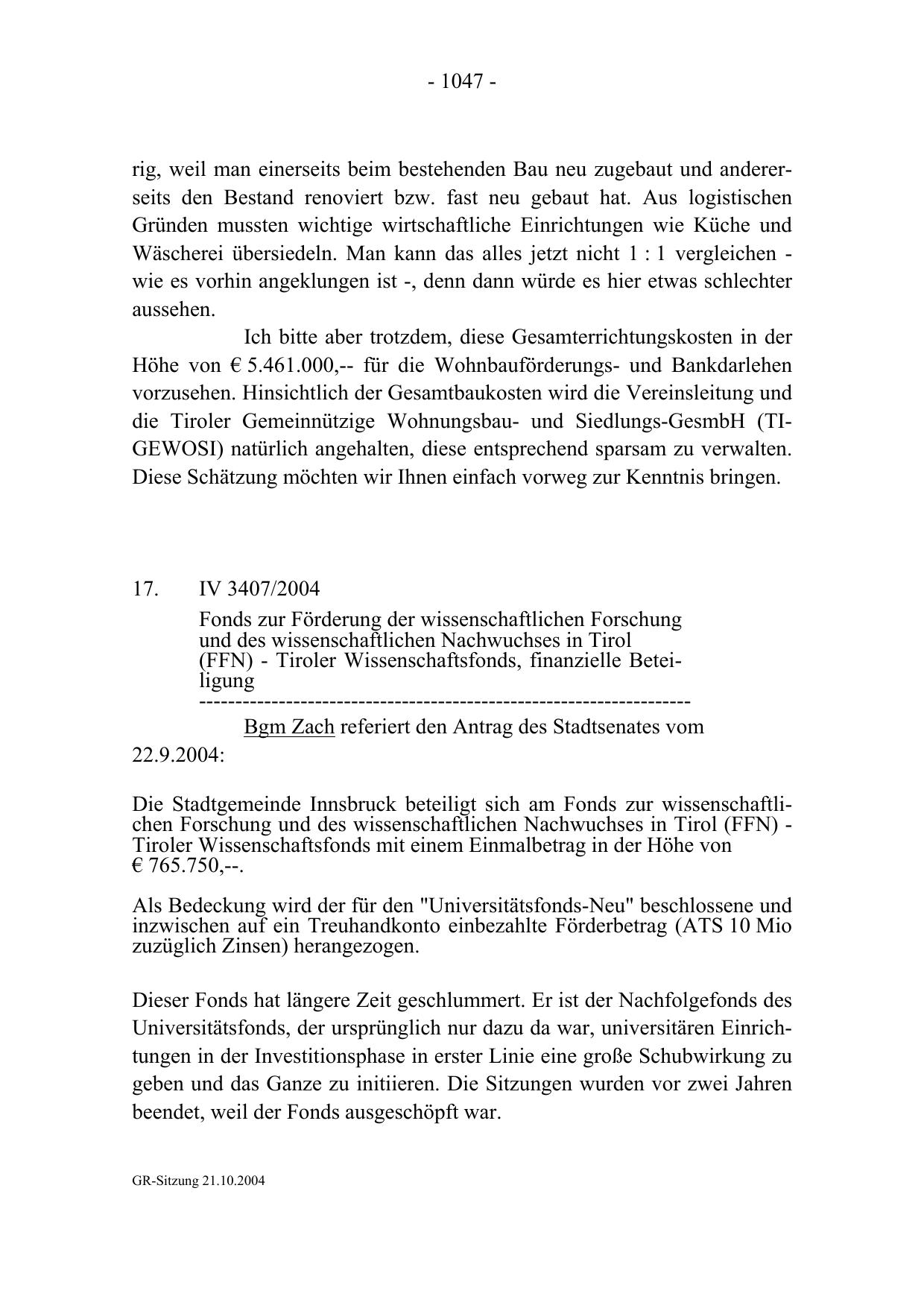 Die Stadtgemeinde Innsbruck beteiligt sich am Fonds zur wissenschaftlichen Forschung und des wissenschaftlichen Nachwuchses in Tirol (FFN) Tiroler Wissenschaftsfonds mit einem Einmalbetrag in der Höhe von