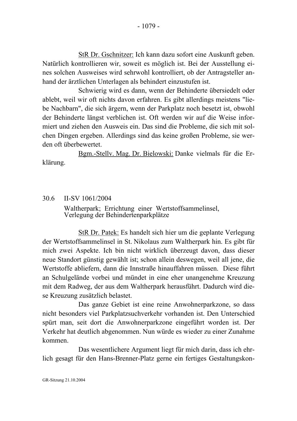 Das wesentlichere Argument liegt für mich darin, dass ich ehrlich gesagt für den Hans-Brenner-Platz gerne ein fertiges GestaltungskonGR-Sitzung 21.10.2004