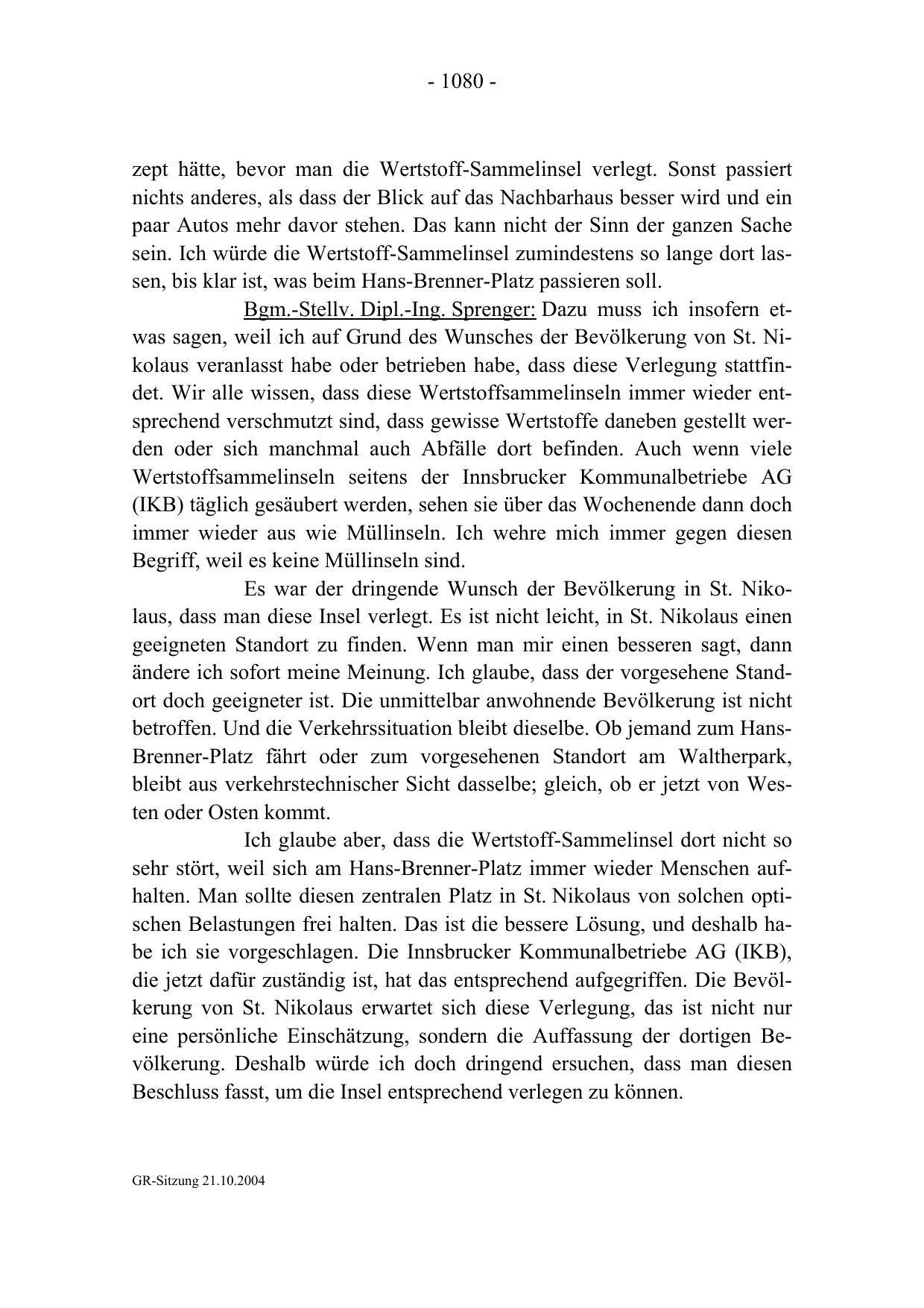 sehr stört, weil sich am Hans-Brenner-Platz immer wieder Menschen aufhalten. Man sollte diesen zentralen Platz in St. Nikolaus von solchen optischen Belastungen frei halten. Das ist die bessere Lösung, und deshalb habe ich sie vorgeschlagen. Die Innsbrucker Kommunalbetriebe AG (IKB),