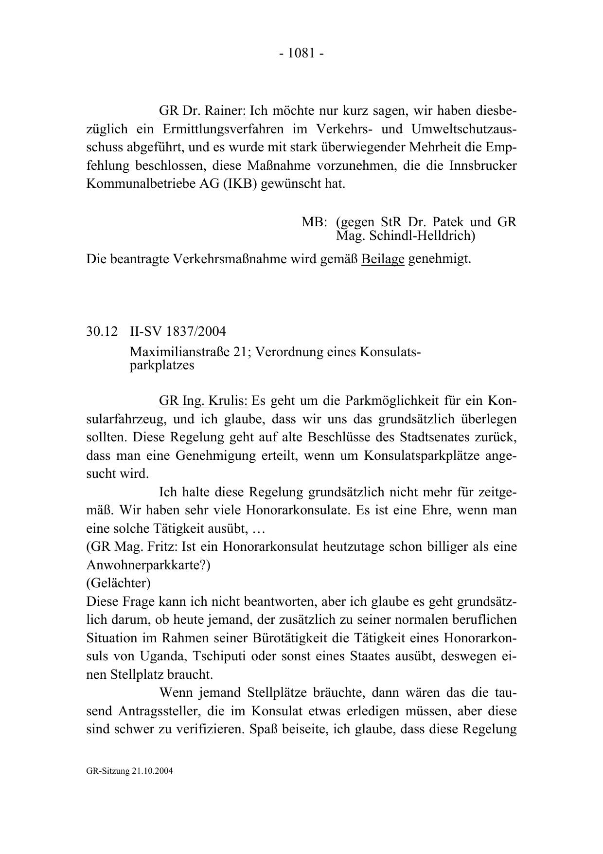 GR Ing. Krulis: Es geht um die Parkmöglichkeit für ein Konsularfahrzeug, und ich glaube, dass wir uns das grundsätzlich überlegen