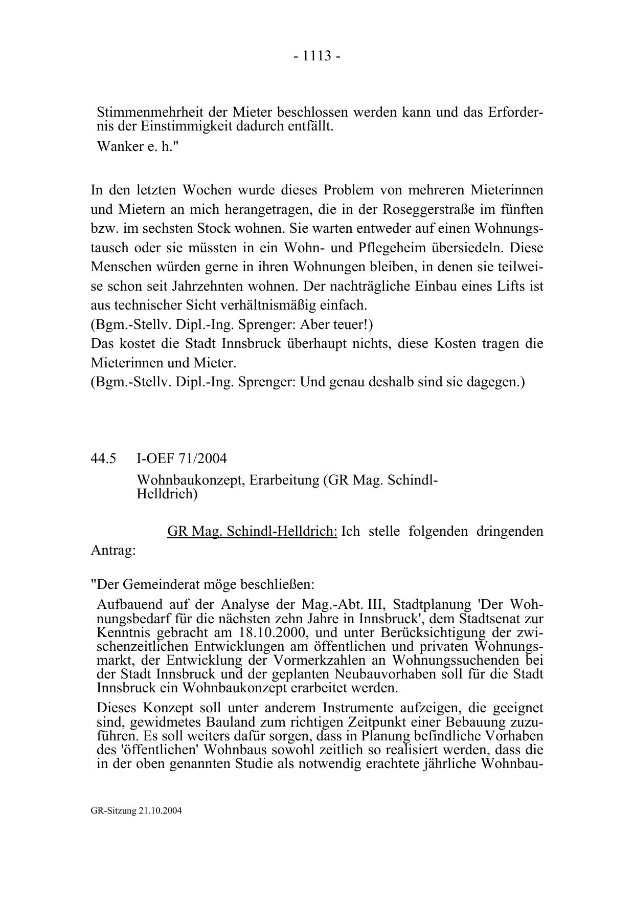 in der oben genannten Studie als notwendig erachtete jährliche WohnbauGR-Sitzung 21.10.2004