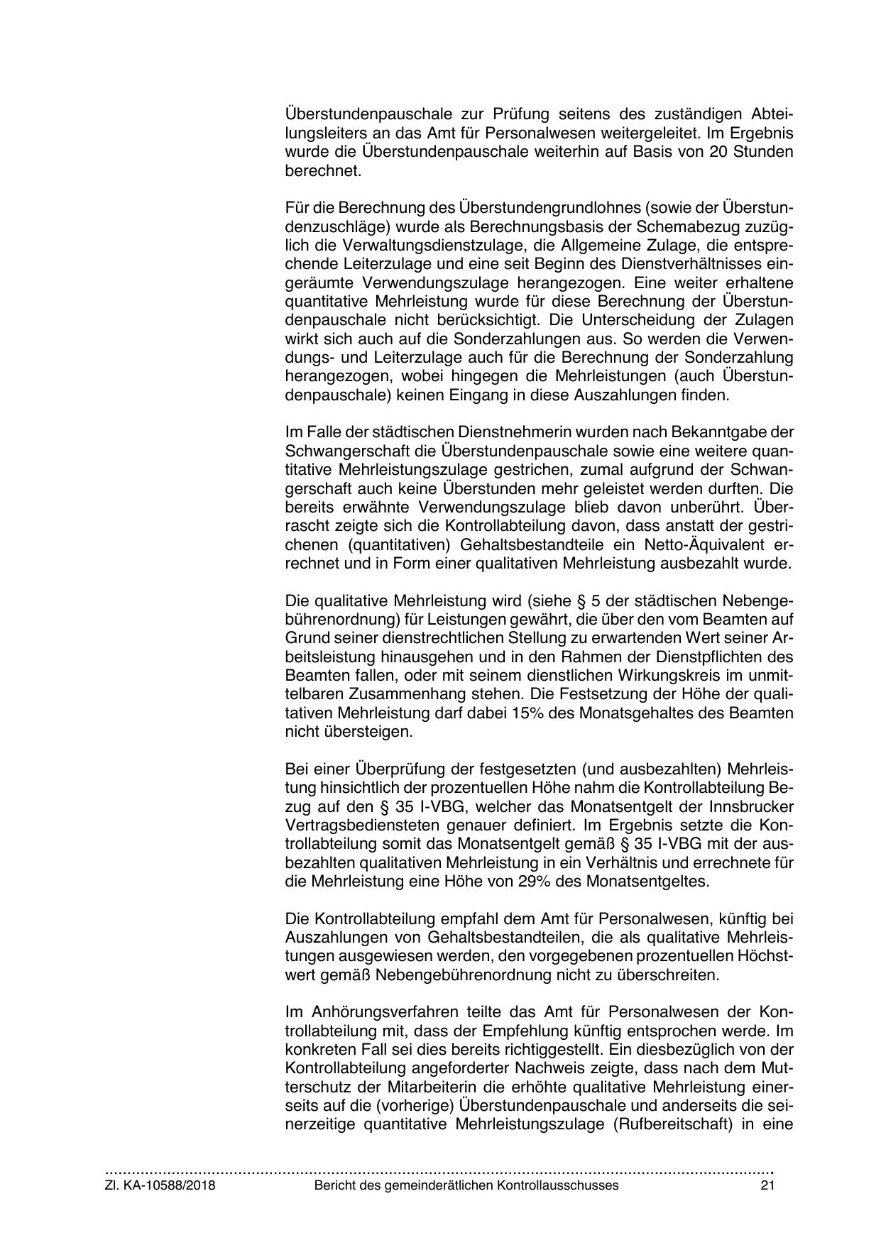 Bei einer Überprüfung der festgesetzten (und ausbezahlten) Mehrleistung hinsichtlich der prozentuellen Höhe nahm die Kontrollabteilung Bezug auf den § 35 I-VBG, welcher das Monatsentgelt der Innsbrucker