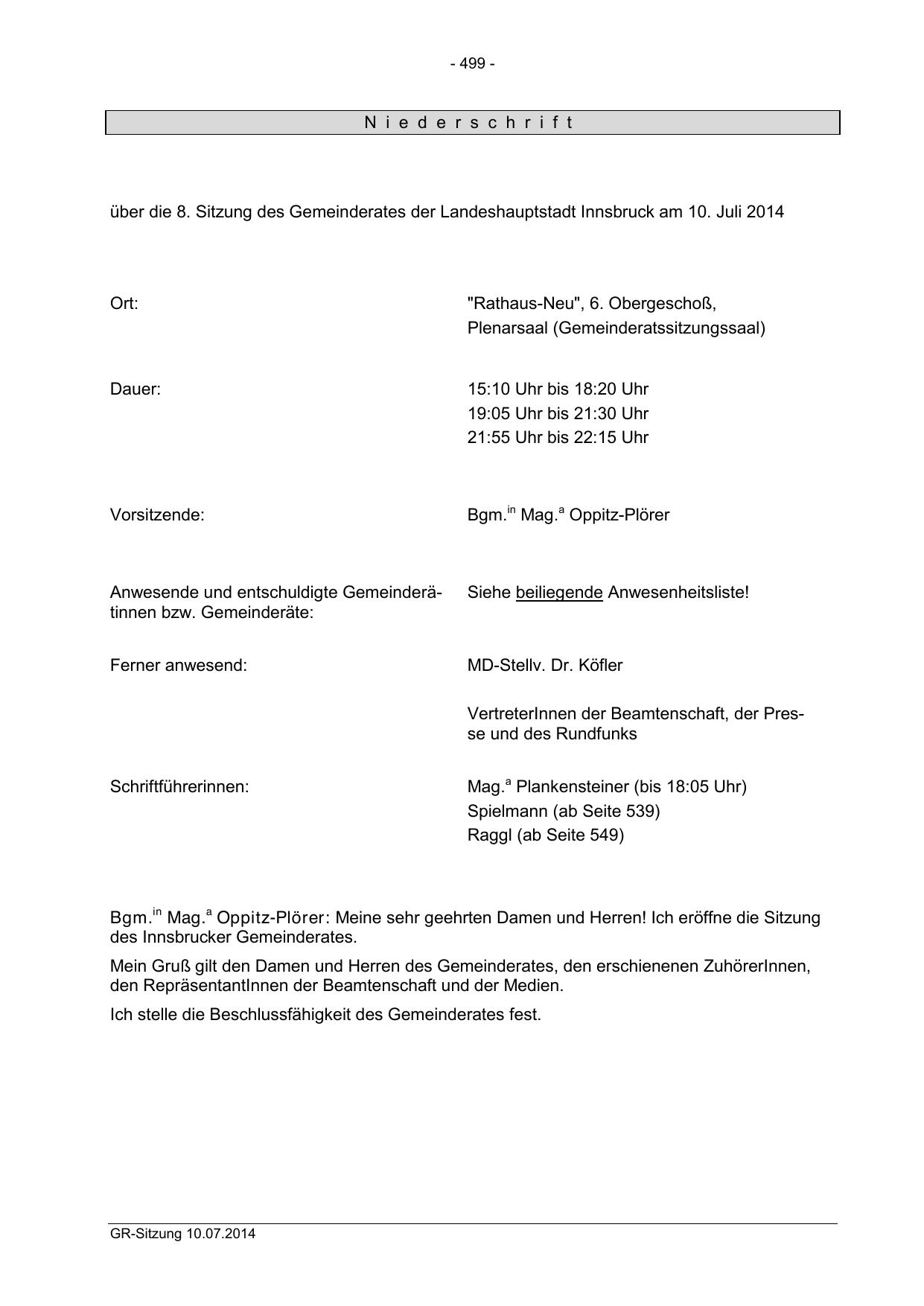 über die 8. Sitzung des Gemeinderates der Landeshauptstadt Innsbruck am 10. Juli 2014