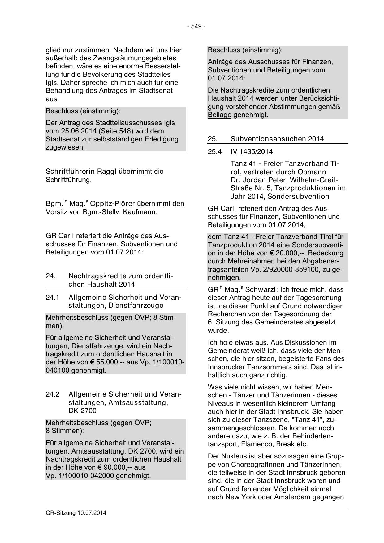 Mehrheitsbeschluss (gegen ÖVP; 8 Stimmen):