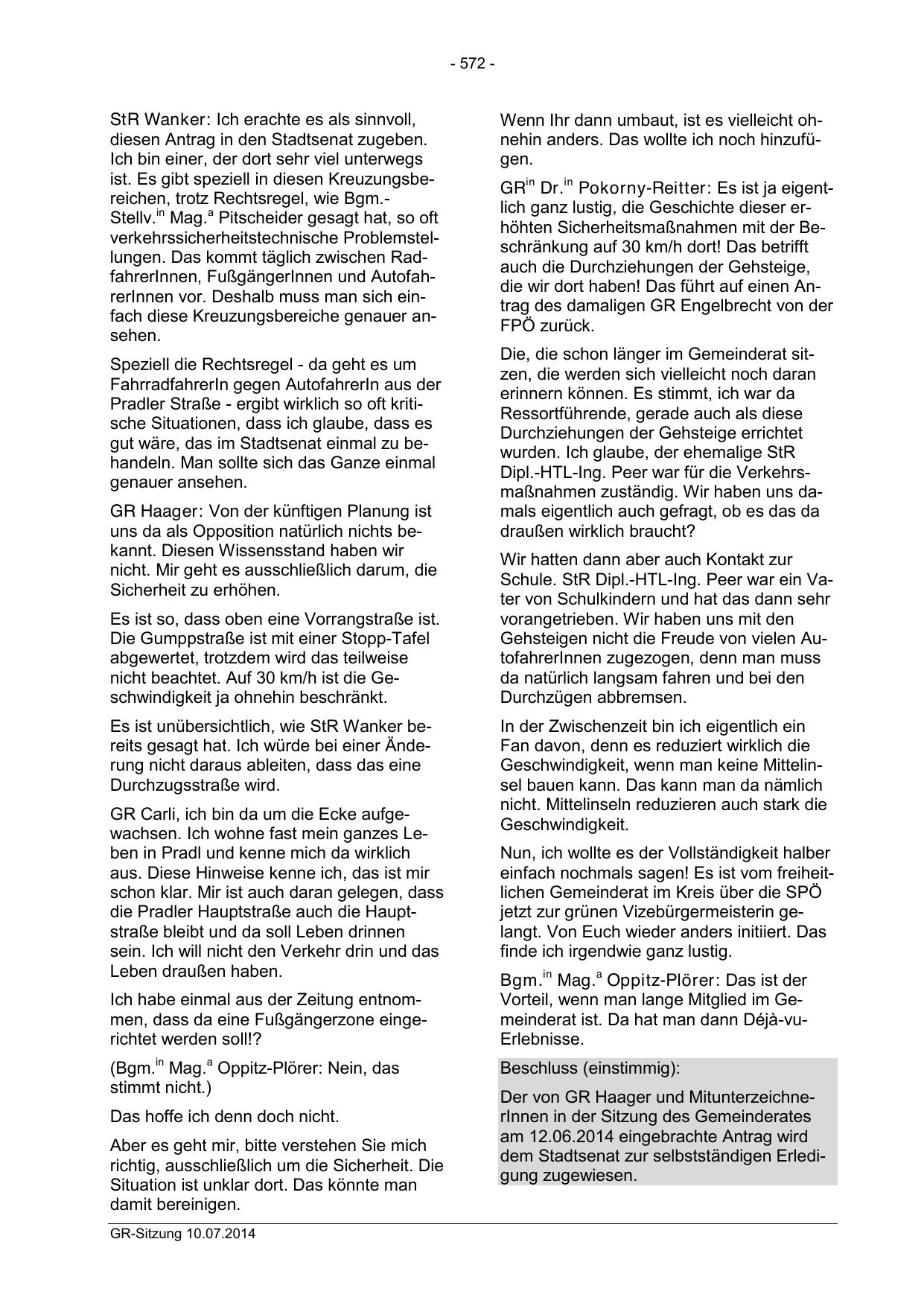 GRin Dr.in Pokorny-Reitter: Es ist ja eigentlich ganz lustig, die Geschichte dieser erhöhten Sicherheitsmaßnahmen mit der Beschränkung auf 30 km/h dort! Das betrifft