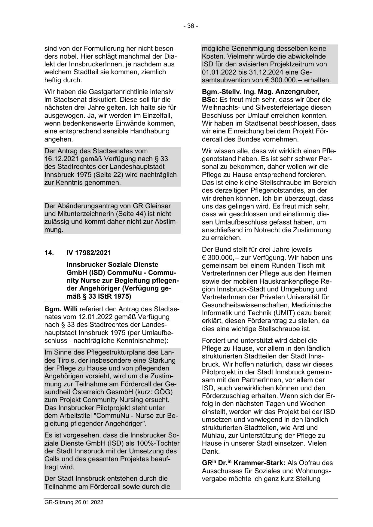nach § 33 des Stadtrechtes der Landeshauptstadt Innsbruck 1975 (per Umlaufbeschluss - nachträgliche Kenntnisnahme):