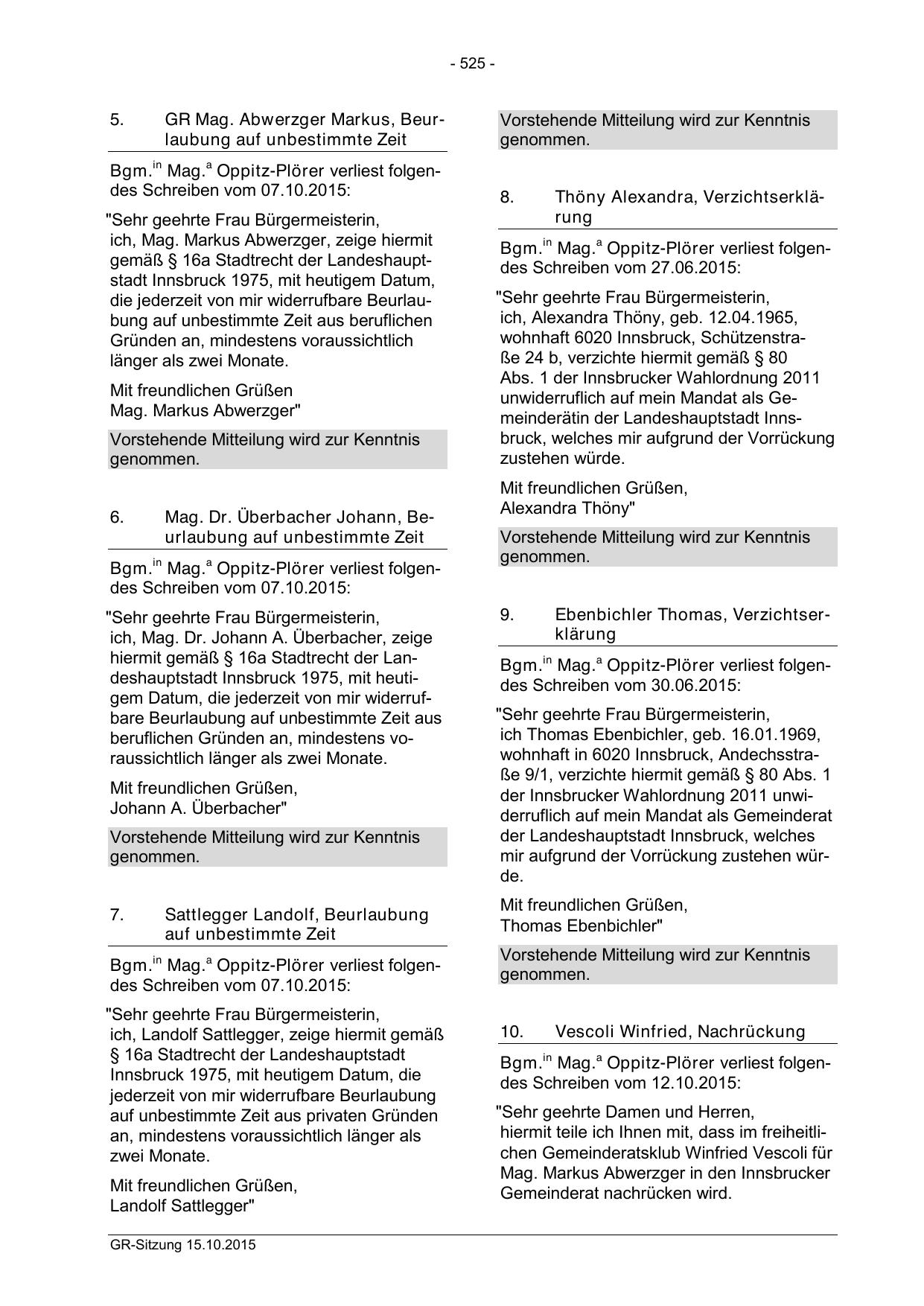 Bgm.in Mag.a Oppitz-Plörer verliest folgendes Schreiben vom 12.10.2015: