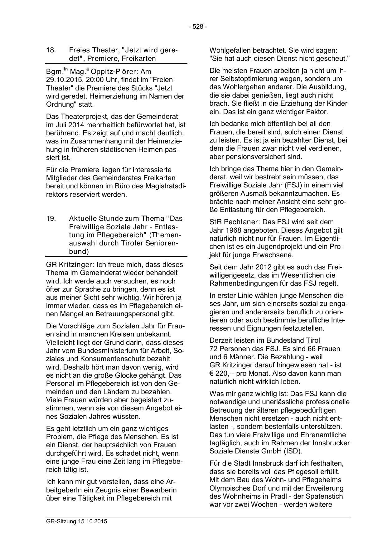 Freiwillige Soziale Jahr - Entlastung im Pflegebereich" (Themenauswahl durch Tiroler Seniorenbund)