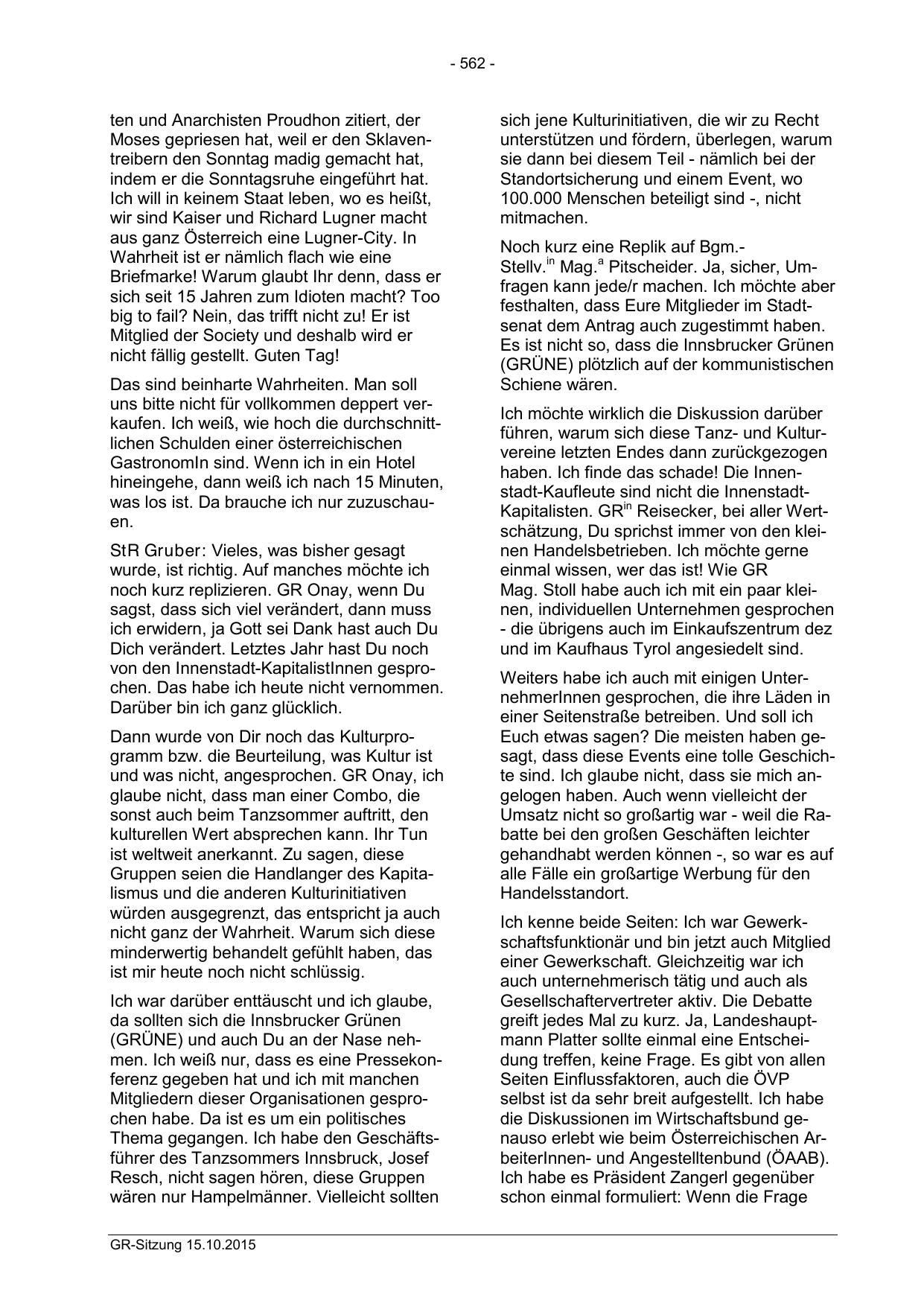 haben. Ich finde das schade! Die Innenstadt-Kaufleute sind nicht die InnenstadtKapitalisten. GRin Reisecker, bei aller Wertschätzung, Du sprichst immer von den kleinen Handelsbetrieben. Ich möchte gerne