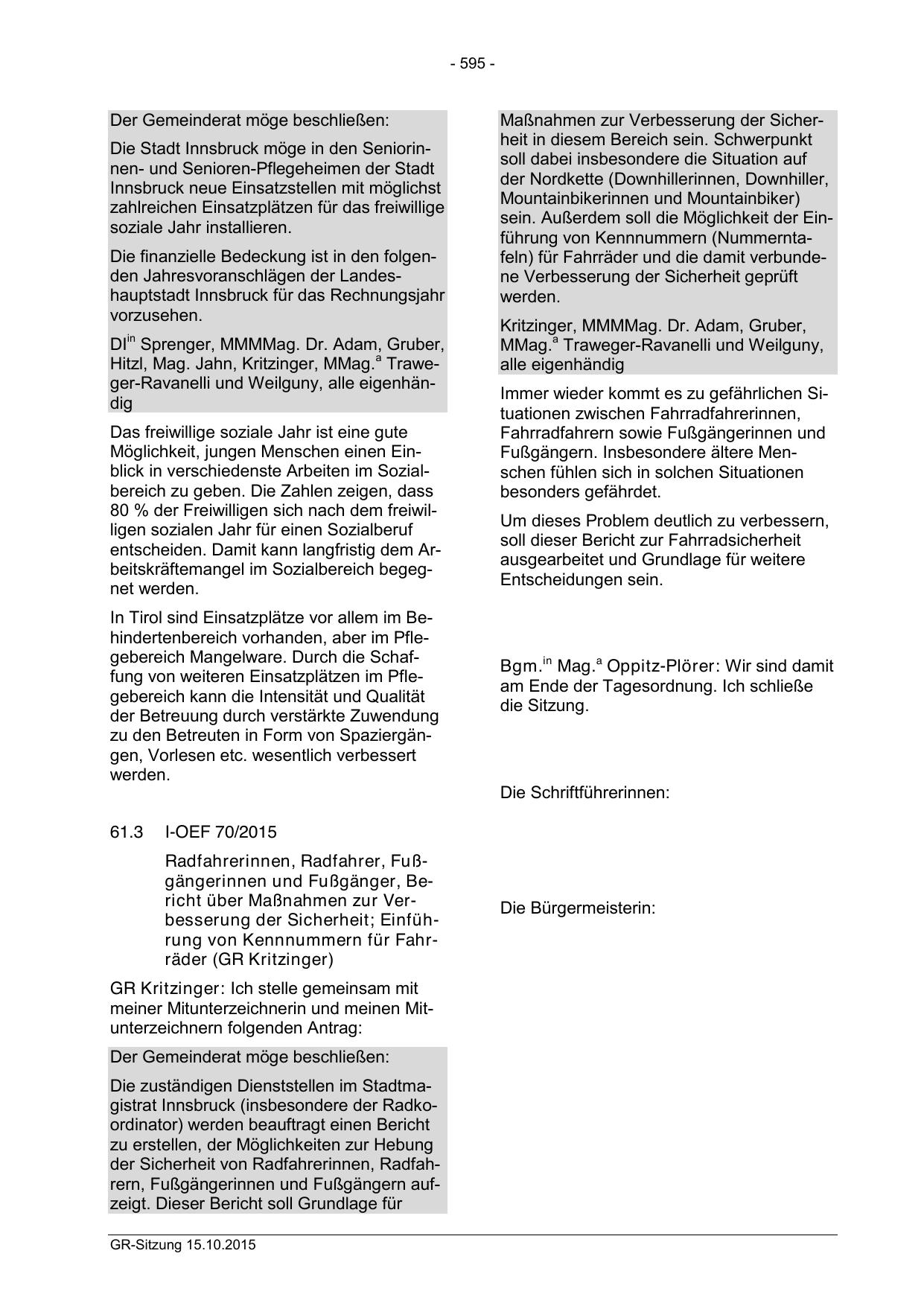 Die zuständigen Dienststellen im Stadtmagistrat Innsbruck (insbesondere der Radkoordinator) werden beauftragt einen Bericht