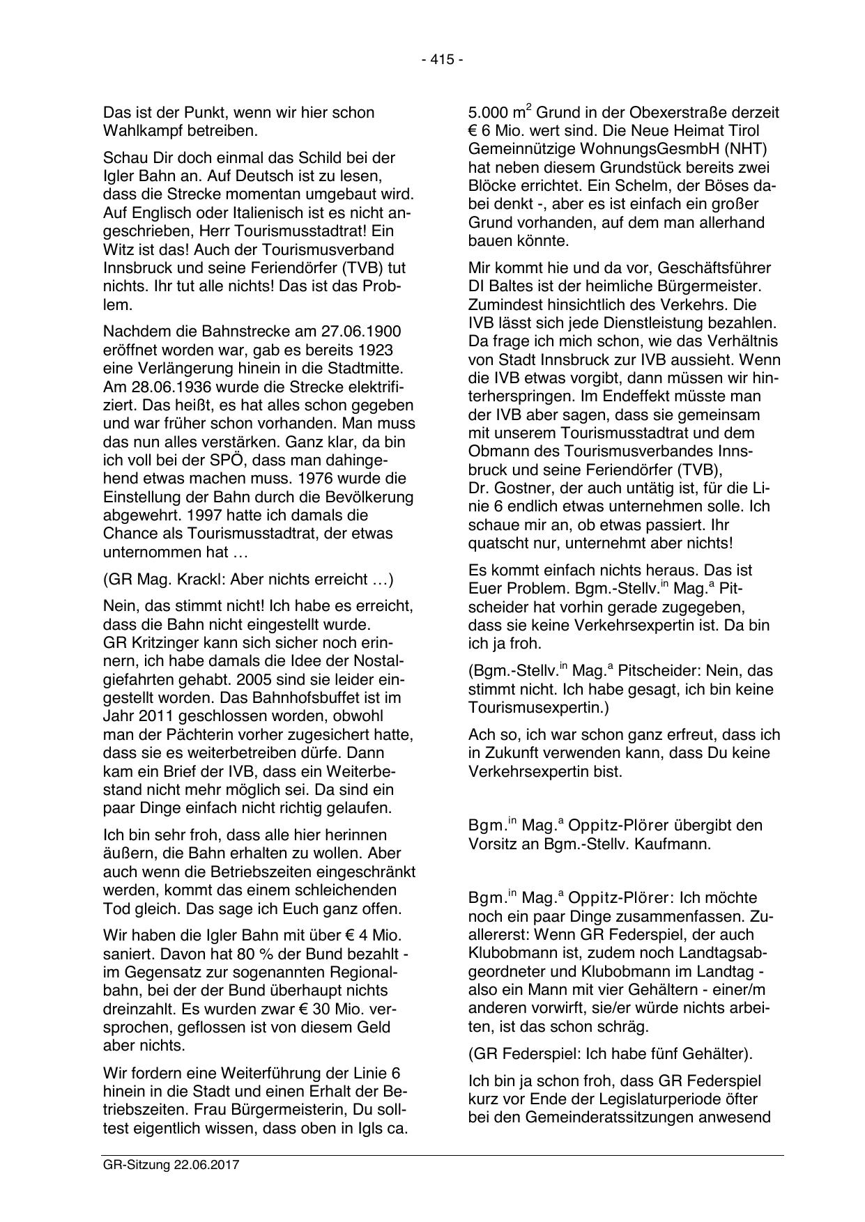 hinein in die Stadt und einen Erhalt der Betriebszeiten. Frau Bürgermeisterin, Du solltest eigentlich wissen, dass oben in Igls ca.
