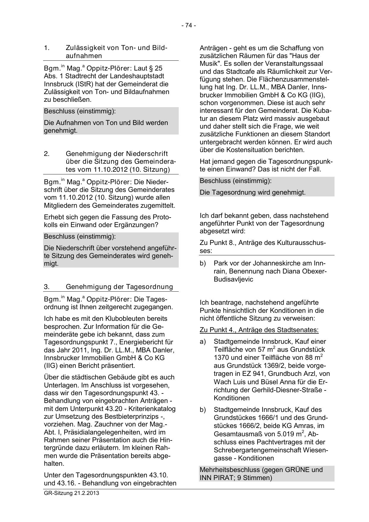 Bgm.in Mag.a Oppitz-Plörer: Die Niederschrift über die Sitzung des Gemeinderates