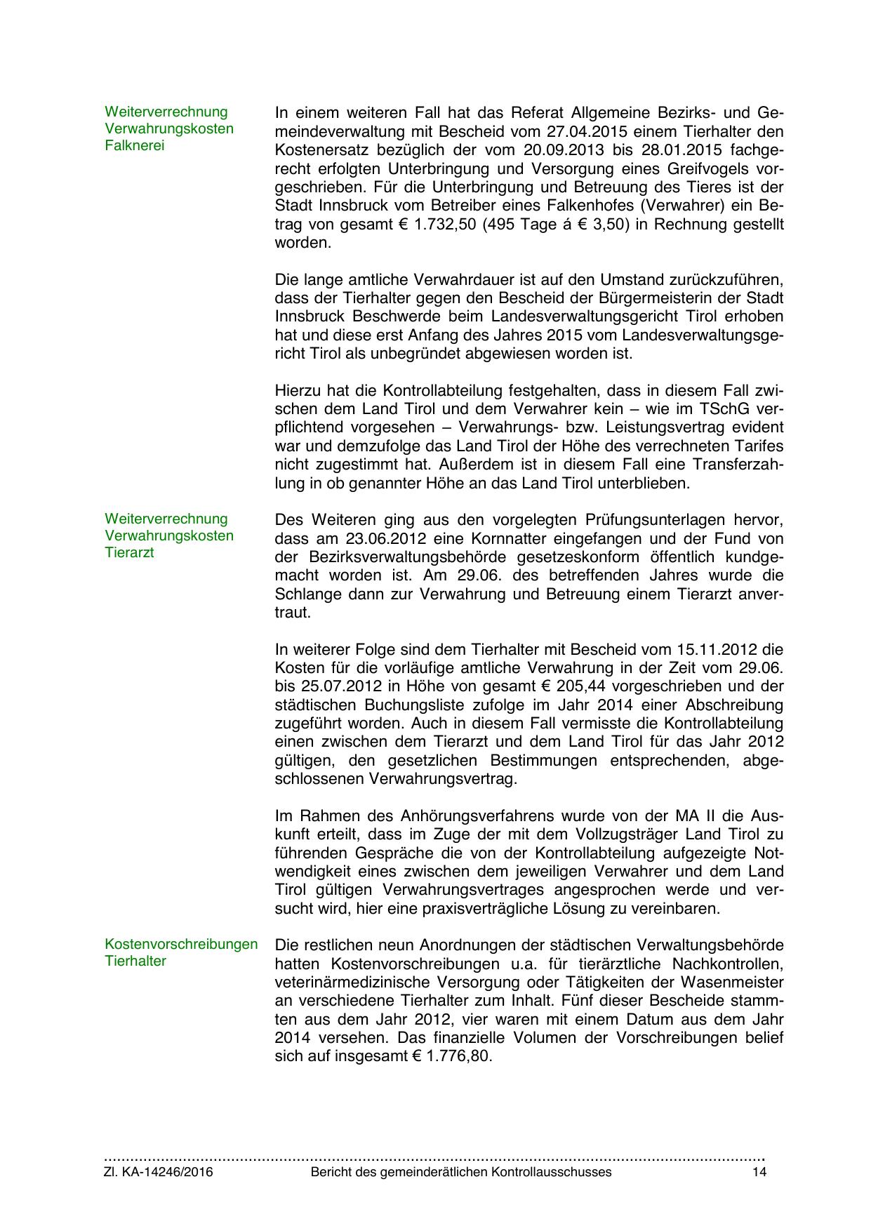 Stadt Innsbruck vom Betreiber eines Falkenhofes (Verwahrer) ein Betrag von gesamt € 1.732,50 (495 Tage á € 3,50) in Rechnung gestellt