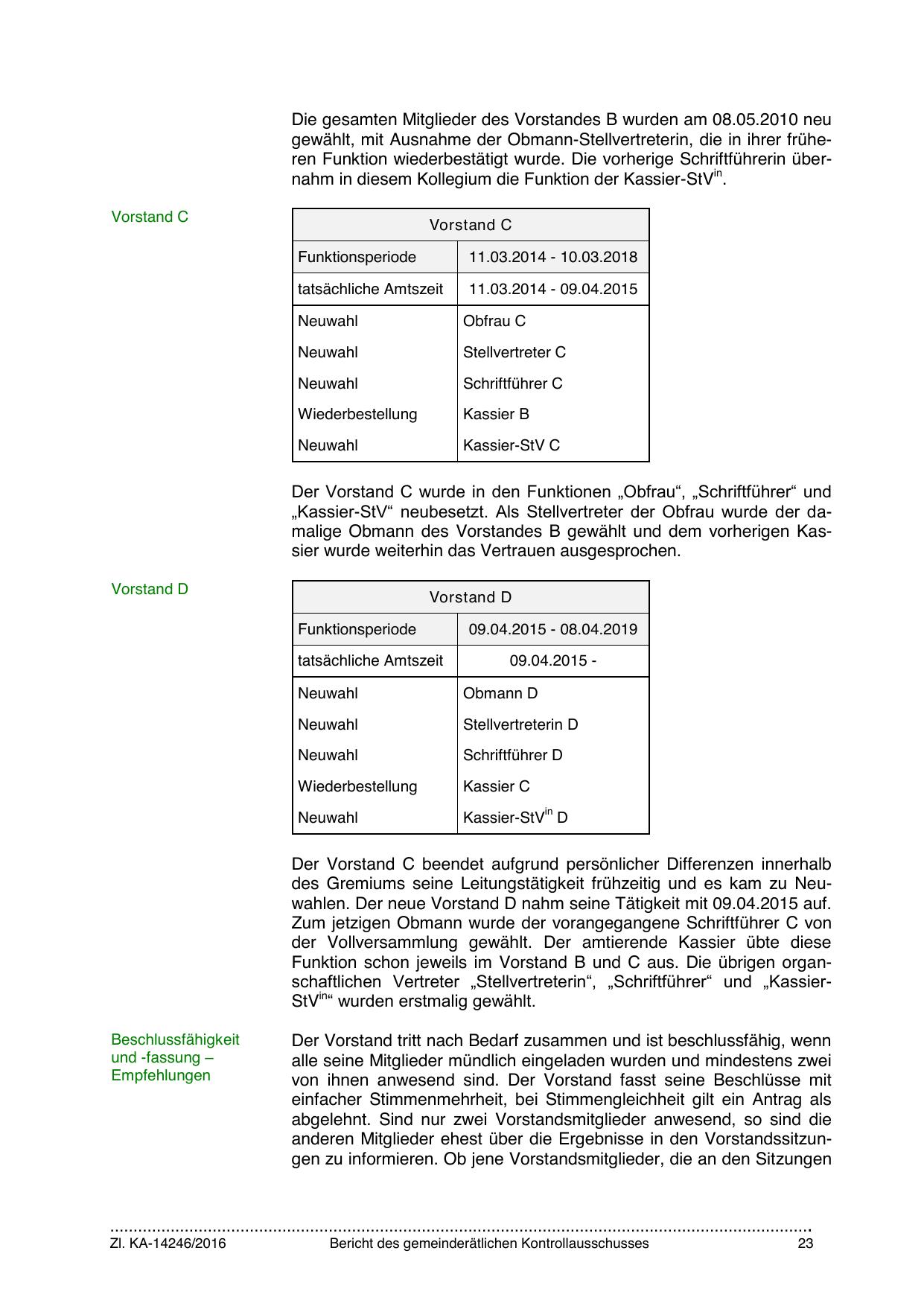 Funktion schon jeweils im Vorstand B und C aus. Die übrigen organschaftlichen Vertreter „Stellvertreterin“, „Schriftführer“ und „KassierStVin“ wurden erstmalig gewählt.