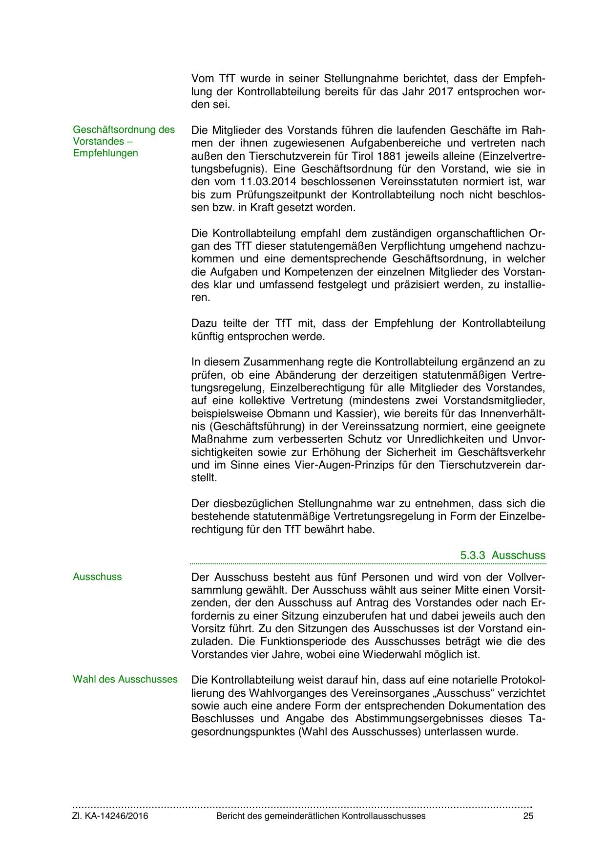 Die Kontrollabteilung empfahl dem zuständigen organschaftlichen Organ des TfT dieser statutengemäßen Verpflichtung umgehend nachzukommen und eine dementsprechende Geschäftsordnung, in welcher