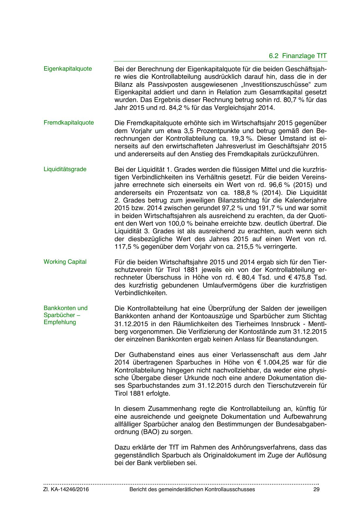 31.12.2015 in den Räumlichkeiten des Tierheimes Innsbruck - Mentlberg vorgenommen. Die Verifizierung der Kontostände zum 31.12.2015