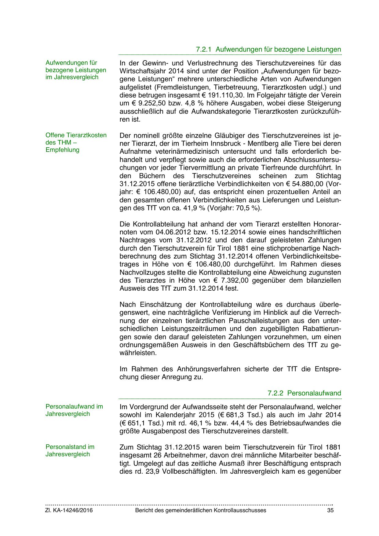 durch den Tierschutzverein für Tirol 1881 eine stichprobenartige Nachberechnung des zum Stichtag 31.12.2014 offenen Verbindlichkeitsbetrages in Höhe von € 106.480,00 durchgeführt. Im Rahmen dieses
