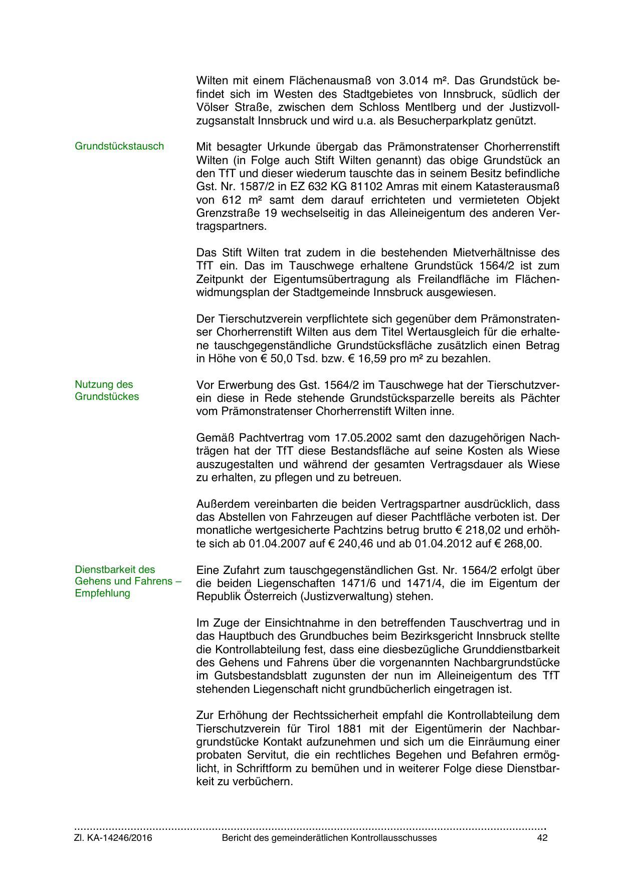 Der Tierschutzverein verpflichtete sich gegenüber dem Prämonstratenser Chorherrenstift Wilten aus dem Titel Wertausgleich für die erhaltene tauschgegenständliche Grundstücksfläche zusätzlich einen Betrag