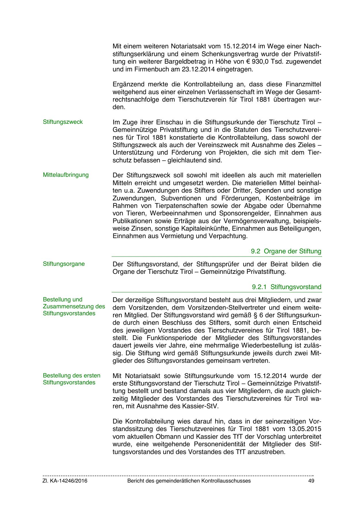Gemeinnützige Privatstiftung und in die Statuten des Tierschutzvereines für Tirol 1881 konstatierte die Kontrollabteilung, dass sowohl der